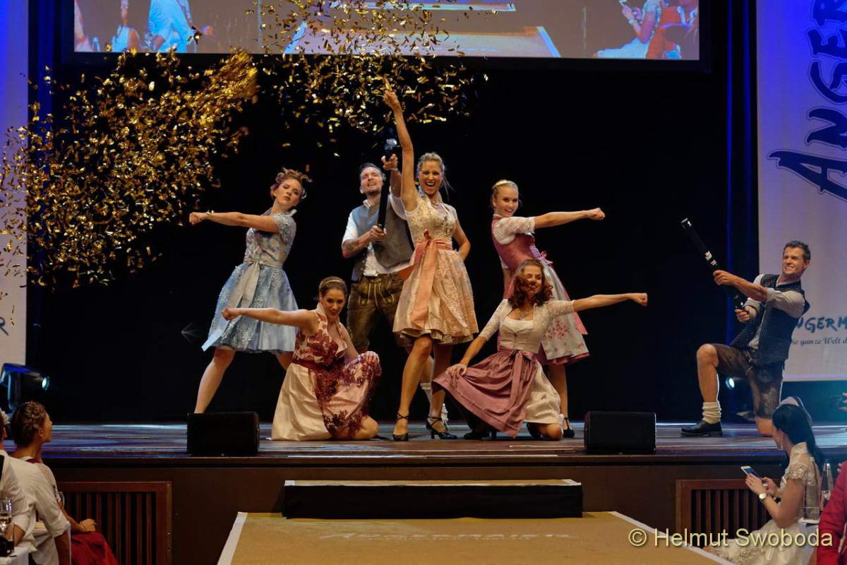 Neben Bier vom Fass und bayerischen Schmankerln bekamen die Gäste bei der „Wiesn-Trend-Modenschau“ auch die neuesten Trachten-Kreationen serviert. Was trägt man bzw. frau in diesem Jahr auf dem Oktoberfest? Dr. Axel Munz: „Bei den Damen liegen vor allem unsere nostalgischen Modelle hoch im Kurs. Hochgeschlossene Dirndl aus Vintage-Stoffen sowie Rock-Mieder-Kombinationen sind absolut angesagt. Die Farbpaillette reicht von klassischem Oliv, Tannengrün, Dunkelblau und Rot bis hin zu kräftigem Türkis, Mintgrün, Bordeaux, lieblichem Rosa, Senfgelb und Nudetönen. Trendfarben für Fashion Victims sind aber auch Sonnengelb und Kirschrot. Zweiter großer Trend sind unsere opulenten und extravaganten Glamour-Dirndl: Schürzen mit Schmucksteinen, mit Pailletten besetze Brokat-Stoffe, transparente Spitzenrücken, beispielsweise aus der Astrid Söll by Angermaier-Kollektion sowie die brandneuen pompösen Dirndl aus unserer Kooperation mit Harald Glööckler lassen Prinzessinnenträume wahr werden. Sehr beliebt ist auch die Kollektion, die wir mit Cathy Hummels realisiert haben. Bei den „Burschen“ sind unsere Lederhosen im Vintage-Stil mit aufwändigen Stickereien, die es neben den traditionellen Farben nun auch in Gelb, Grün und Hellblau gibt, der Renner.“