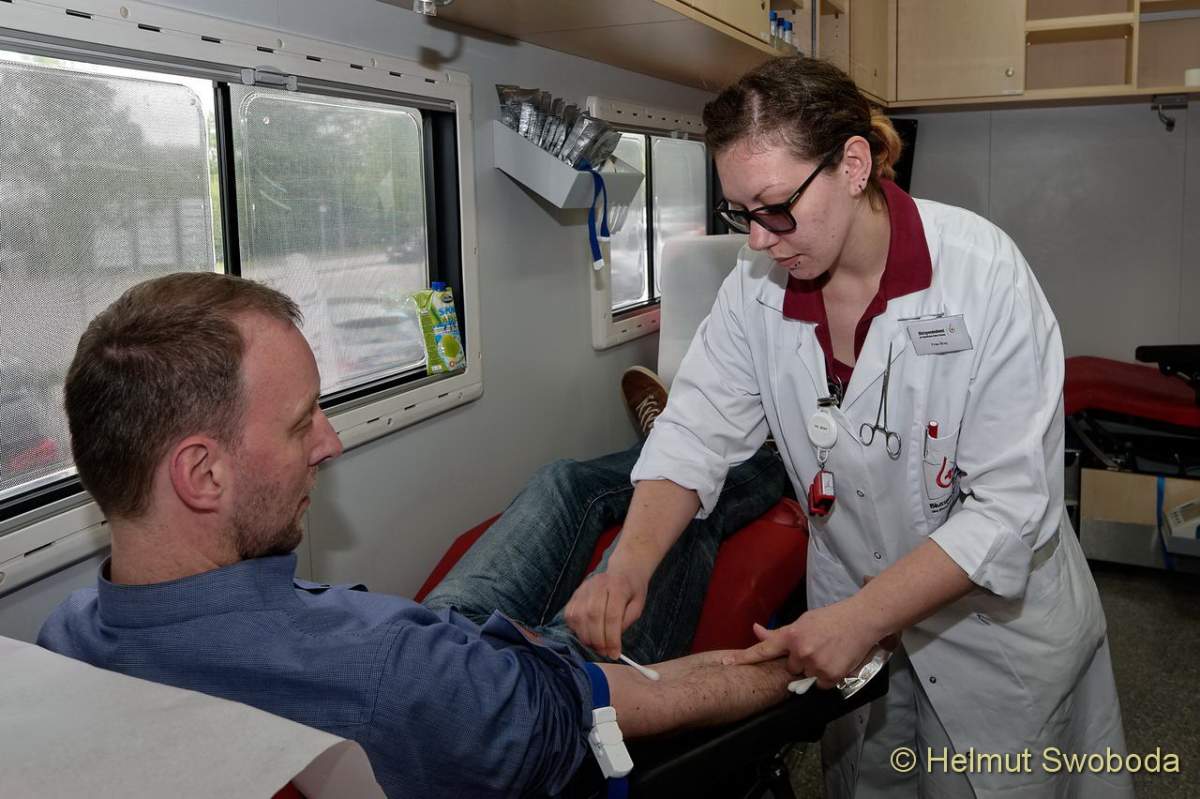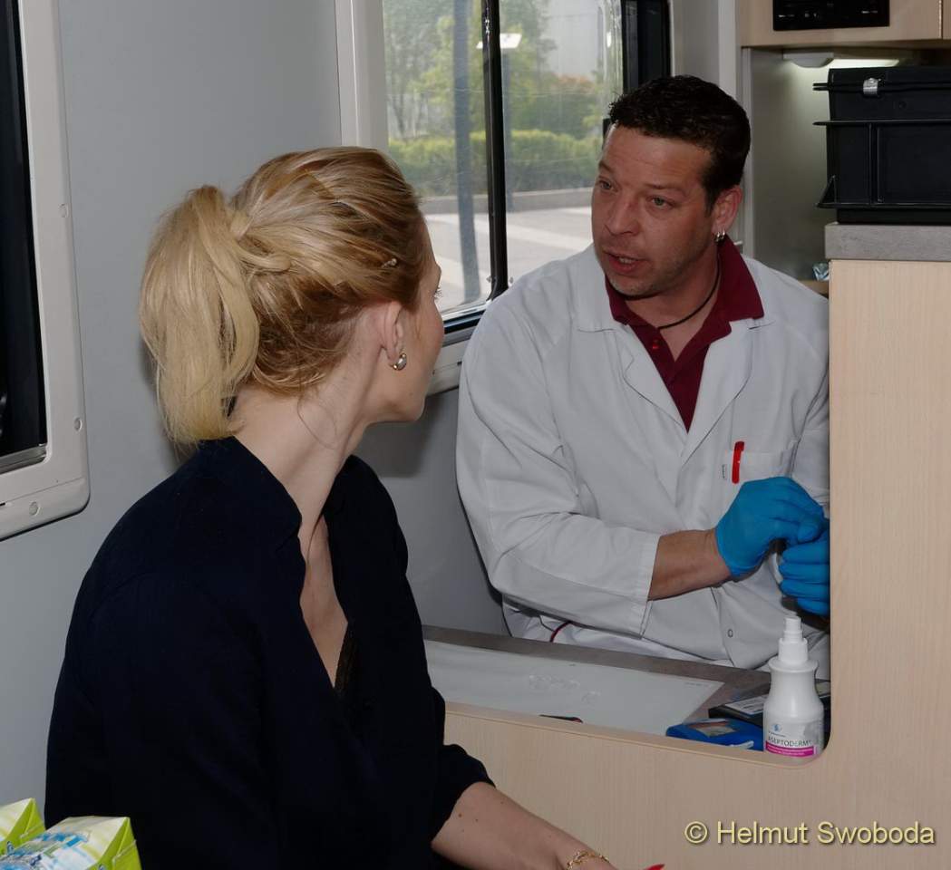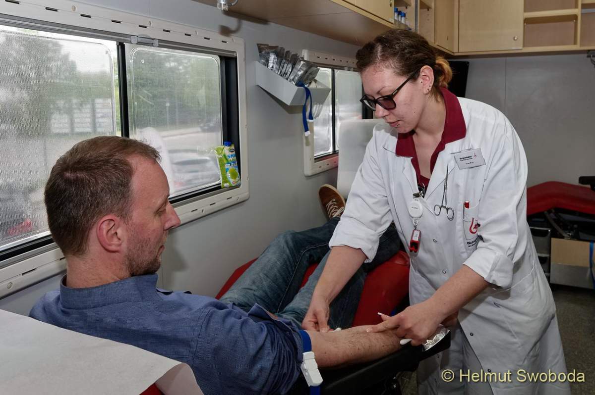Eine Blutspende-Welle rollt seit gestern wieder durch München-Unterföhring. Immer wenn das BlutspendeMobil (BluMo) vor dem Firmengebäude von Sky Deutschland parkt, stürmen die Mitarbeiter des Unternehmens minütlich hinein. Bereits im sechsten Jahr infolge ist der Blutspendedienst des BRK (BSD) mit seinem Flaggschiff hier zu Gast.