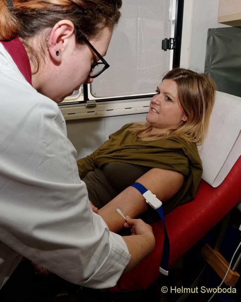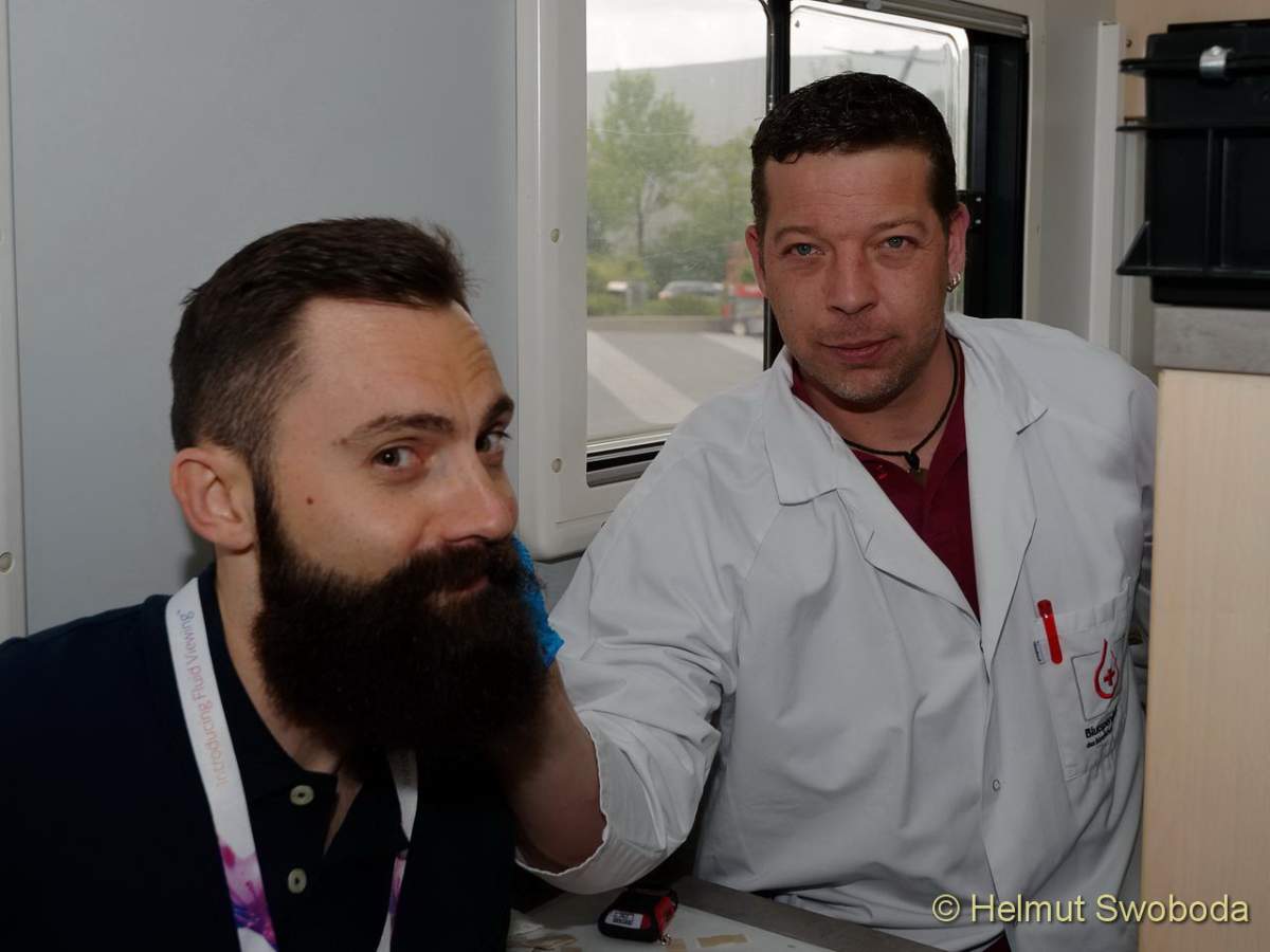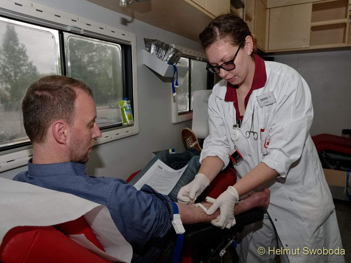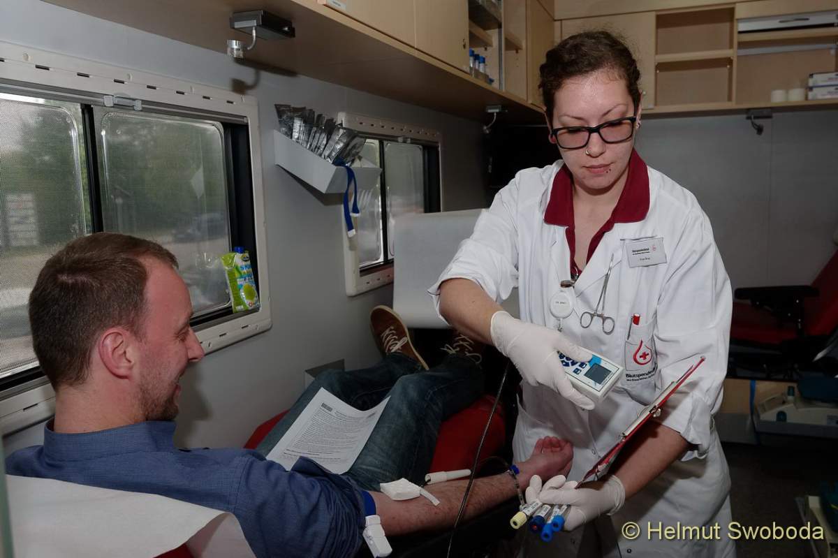 Eine Blutspende-Welle rollt seit gestern wieder durch München-Unterföhring. Immer wenn das BlutspendeMobil (BluMo) vor dem Firmengebäude von Sky Deutschland parkt, stürmen die Mitarbeiter des Unternehmens minütlich hinein. Bereits im sechsten Jahr infolge ist der Blutspendedienst des BRK (BSD) mit seinem Flaggschiff hier zu Gast.