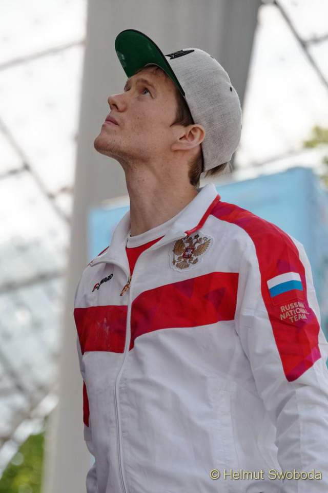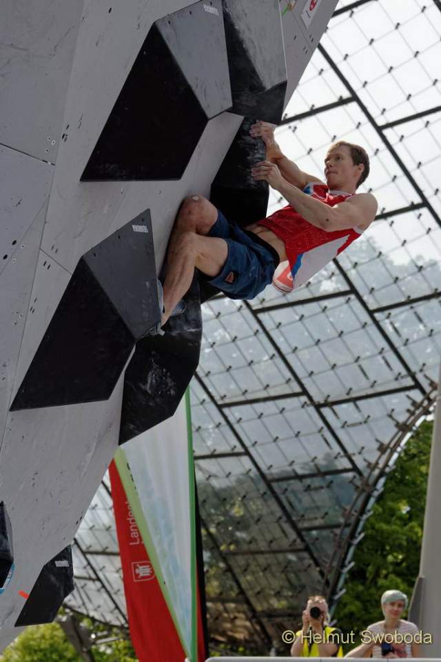 Weiter ging es mit Boulder drei, einem Plattenboulder. Hier musste man an Volumen wackelig aufstehen und hatte einen Fingernagel großen Griff dafür. Stand man einmal benötigte es noch einen Sprung nach oben – ca 1,5 Meter! Ondra flashte erneut, Schubert benötigte zwei Versuche, der Russe Aleksey Rubtsov drei. Hojer, der Slowene Anze Peharc und Chon erreichten nur die Zone. Schubert und Rubtsov verbesserten sich auf Platz zwei und drei.