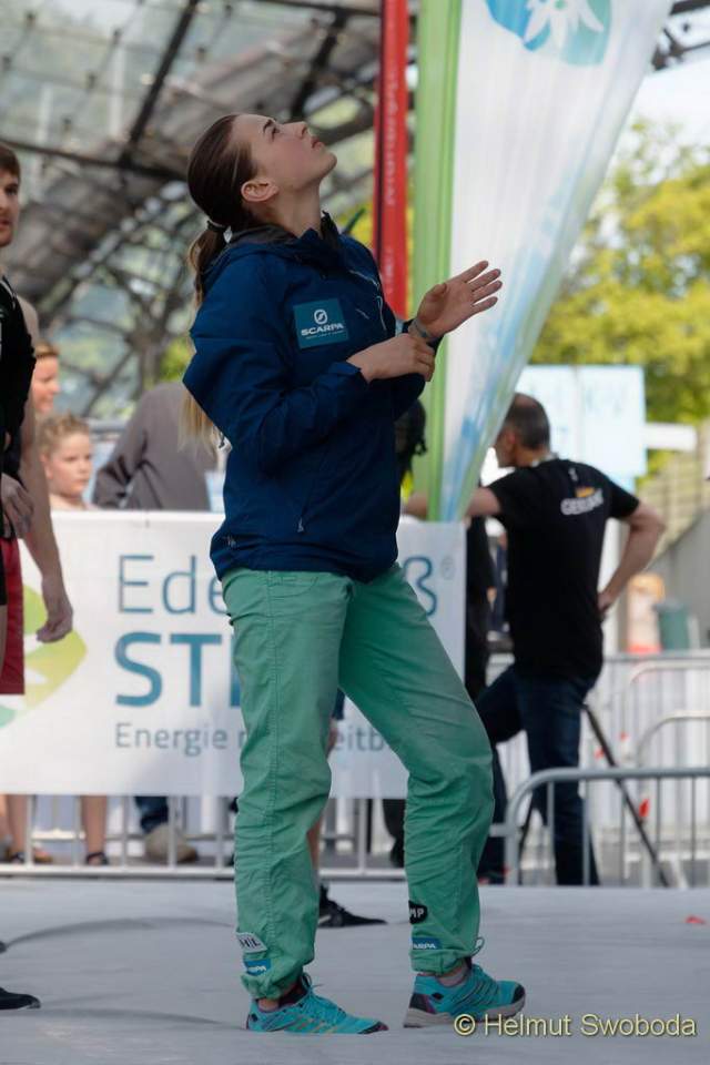 Zum Damenfinale kühlte es merklich ab. Darüber freuten sich vor allem die Athletinnen, denn für die vier schwierigen Routen brauchte man jeden Grip, der zu bekommen war. Leider mussten die deutschen Damen aus der Zuschauermenge zusehen, sie konnten kein Halbfinal-Ticket lösen.
