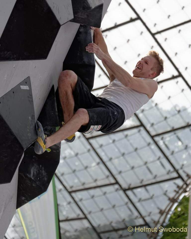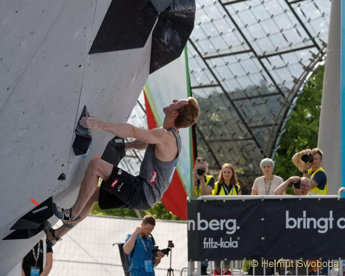 Es war ein super dramatisches Finale: Bereits der erste Boulder hatte es in sich! Durch eine überhängende Wand führte eine unübersichtliche Grifffolge aus großen abschüssigen Volumen. Hier erreichten fünf Athleten nur den Zonengriff, der Tscheche Adam Ondra flashte die Route gleich mal. Hojer lag danach auf Platz 6. Auch er hatte die Zone erreicht, benötigte aber die meisten Versuche.