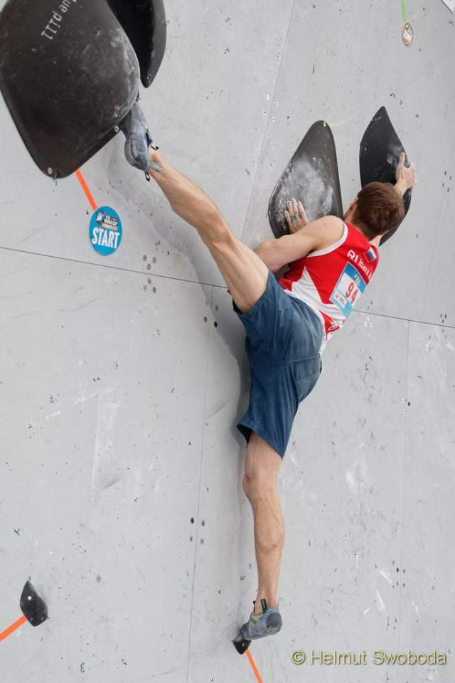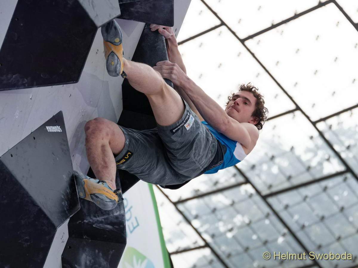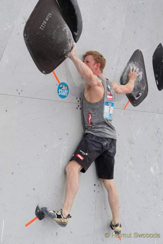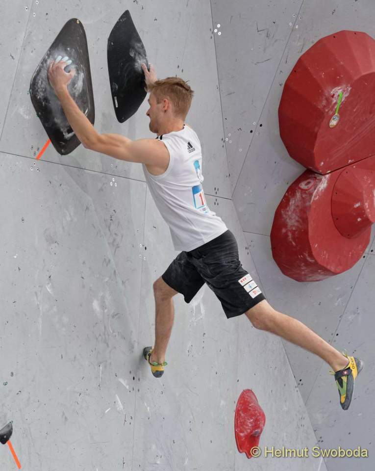 Es war ein super dramatisches Finale: Bereits der erste Boulder hatte es in sich! Durch eine überhängende Wand führte eine unübersichtliche Grifffolge aus großen abschüssigen Volumen. Hier erreichten fünf Athleten nur den Zonengriff, der Tscheche Adam Ondra flashte die Route gleich mal. Hojer lag danach auf Platz 6. Auch er hatte die Zone erreicht, benötigte aber die meisten Versuche.