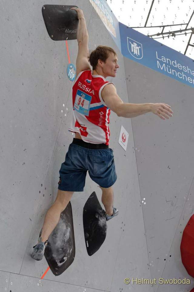 Weiter ging es mit Boulder drei, einem Plattenboulder. Hier musste man an Volumen wackelig aufstehen und hatte einen Fingernagel großen Griff dafür. Stand man einmal benötigte es noch einen Sprung nach oben – ca 1,5 Meter! Ondra flashte erneut, Schubert benötigte zwei Versuche, der Russe Aleksey Rubtsov drei. Hojer, der Slowene Anze Peharc und Chon erreichten nur die Zone. Schubert und Rubtsov verbesserten sich auf Platz zwei und drei.