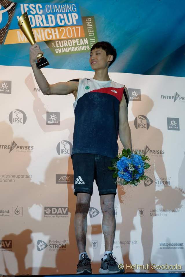 Im Herren-Finale kämpften vier Japaner, Jongwon Chon aus Korea sowie Jan Hojer um den Sieg. Den ersten Boulder, eine diffizile Platte, konnten die Kontrahenten des Deutschen souverän meistern. Hojer brauchte insgesamt fünf Versuche, erst zwei Sekunden vor Ablauf der Zeit konnte er beide Hände an das Top bekommen – unter frenetischem Jubel der Fans sprang er zum Zielgriff. Im zweiten Boulder, bei dem gleich zu Beginn ein weiter Dynamo abgefragt wurde, schaffte Jan Hojer die Sensation: Er flashte die Route, an der alle anderen Finalisten scheiterten. Auch den dritten Boulder konnte Jan Hojer sensationell aufs erste Mal klettern, dies schafften lediglich noch Tomoa Narasaki (JPN) sowie Jongwon Chon (KOR). Nach drei von vier Bouldern lag Jan Hojer immer noch auf Platz eins. Dann kam die letzte Route: Mehrere Dreiecke führten in einem Überhang schräg nach oben. Angefeuert von gut 5000 Zuschauern konnte er auch den letzten Boulder im zweiten Versuch klettern – Platz eins für den Deutschen, der sich mit einer tiefen Verbeugung vor sei-nem Publikum verneigte! Den Gesamtweltcup sicherte sich Jongwon Chon aus Korea.