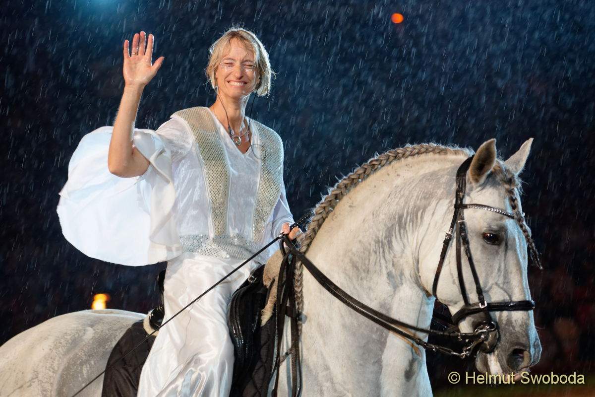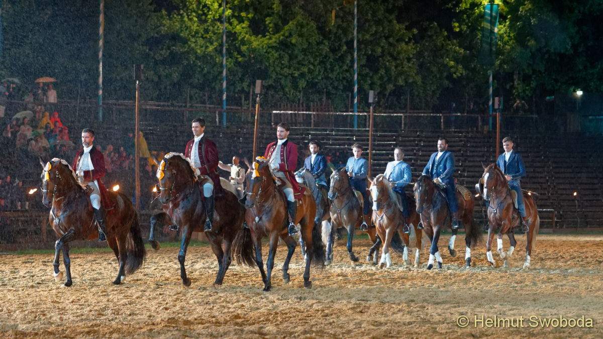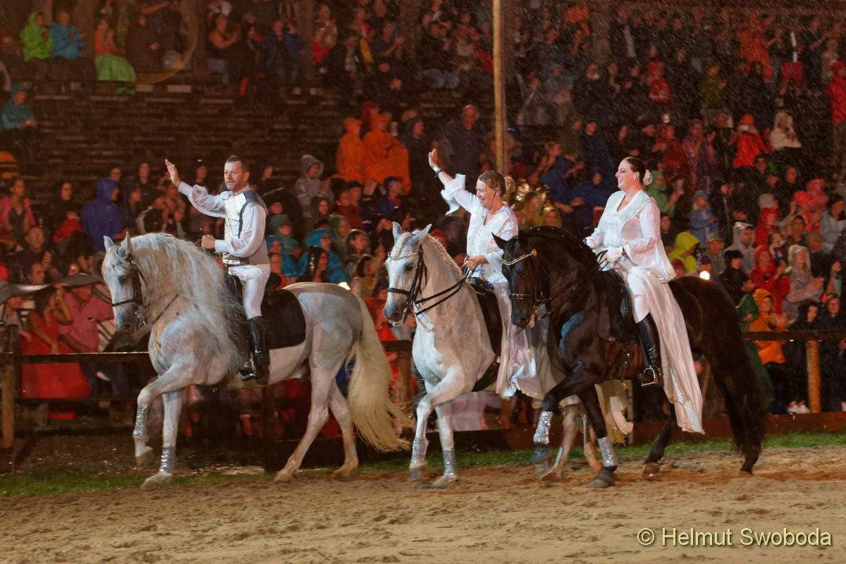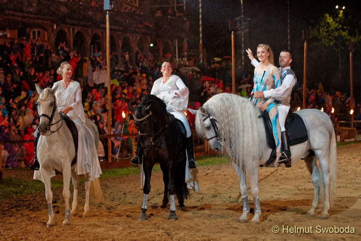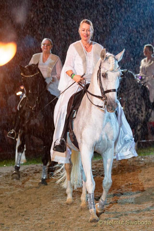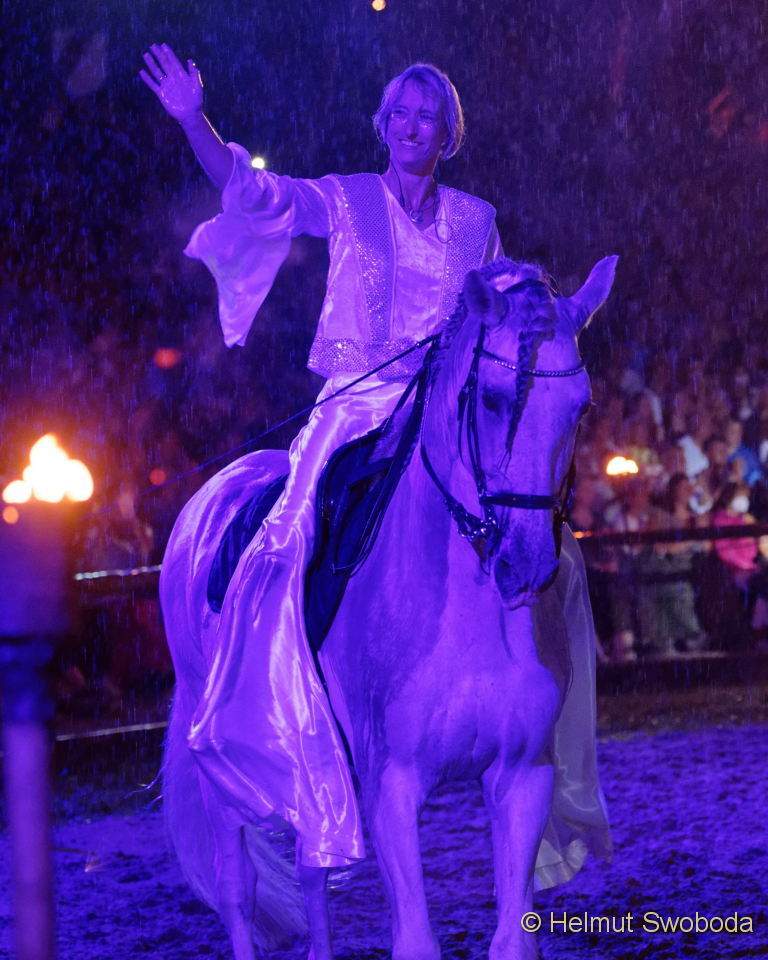 Dieses Jahres traf in der Arena auf Schloss Kaltenberg das meistgespielte Klassikstück der Welt sowie fantasievolle Pferdechoreografien und artistische Meisterleistungen aufeinander. Ein klassisches Open Air Live-Event mit Orchester und Chor, begleitet von ebenso zauberhaften wie dynamischen Pferdechoreografien und artistischen Meisterleistungen. Ein Fest für alle Sinne. Insgesamt rund 30 Pferde waren in der Arena zu sehen und sich mal anmutig, mal dynamisch im Takt der Musik bewegten. „Die Carmina Burana“ ist ein unglaublich mitreißendes Stück“, weiß Karin Stolz von der Reitgruppe Doma Clasica. Stolz ist für die Choreografien verantwortlich und hatte neben Pferden der eigenen Reitgruppe auch Akteure aus Deutschland, Portugal oder Belgien eingeladen. „Das Beste vom Besten“, lacht Stolz.