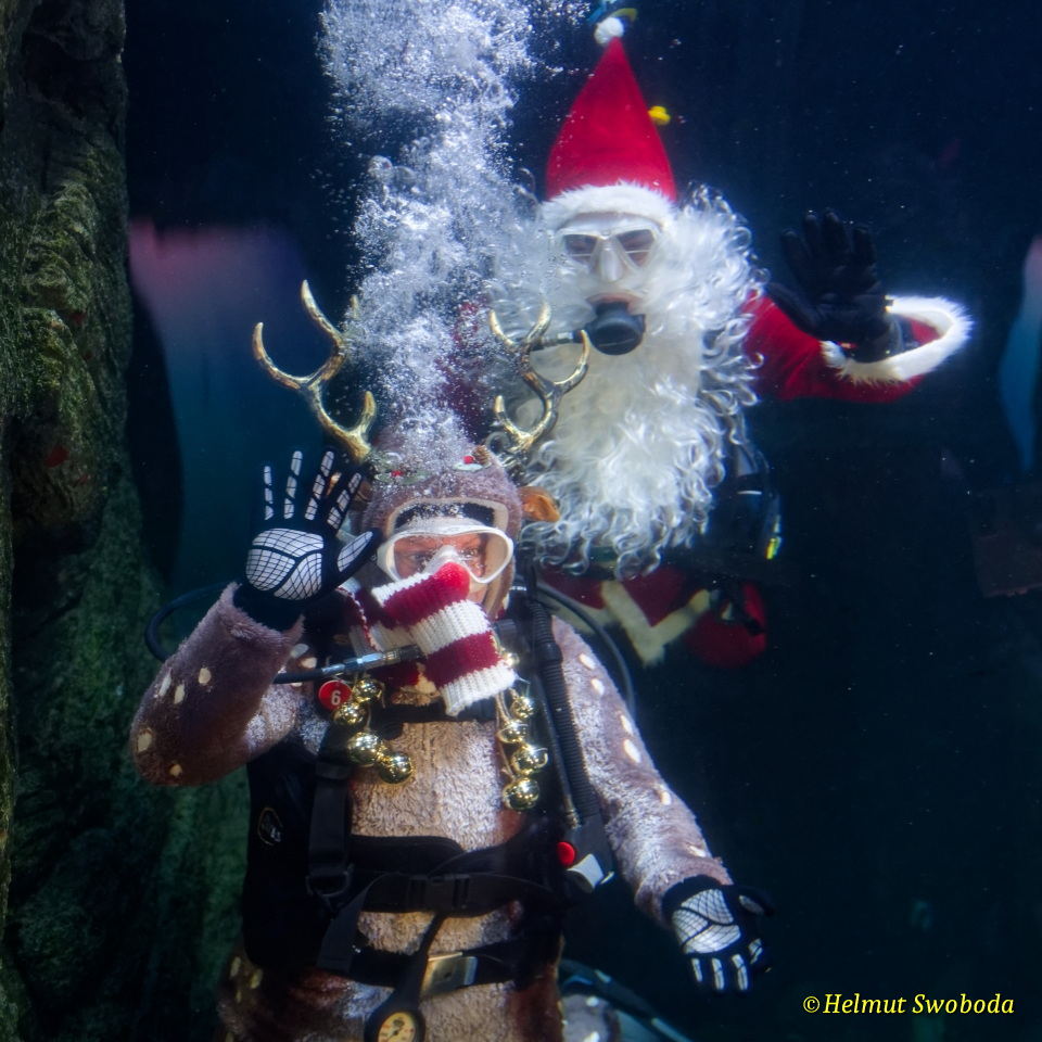 Das winterliche Duo hat allerlei Leckereien für die tierischen Meeresbewohner im Gepäck.