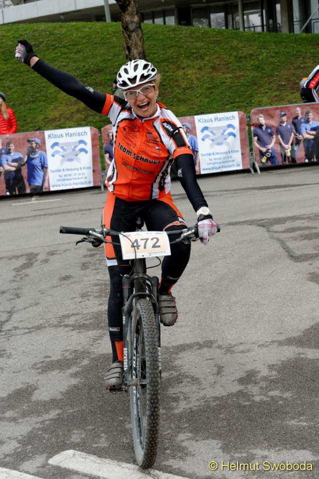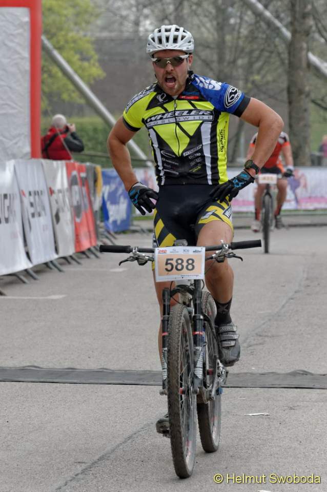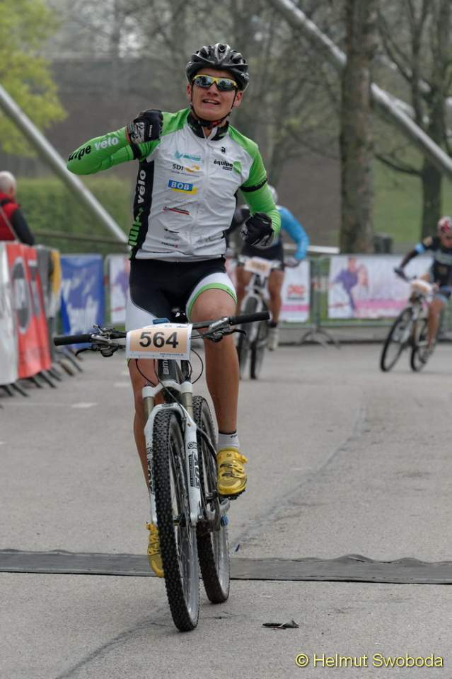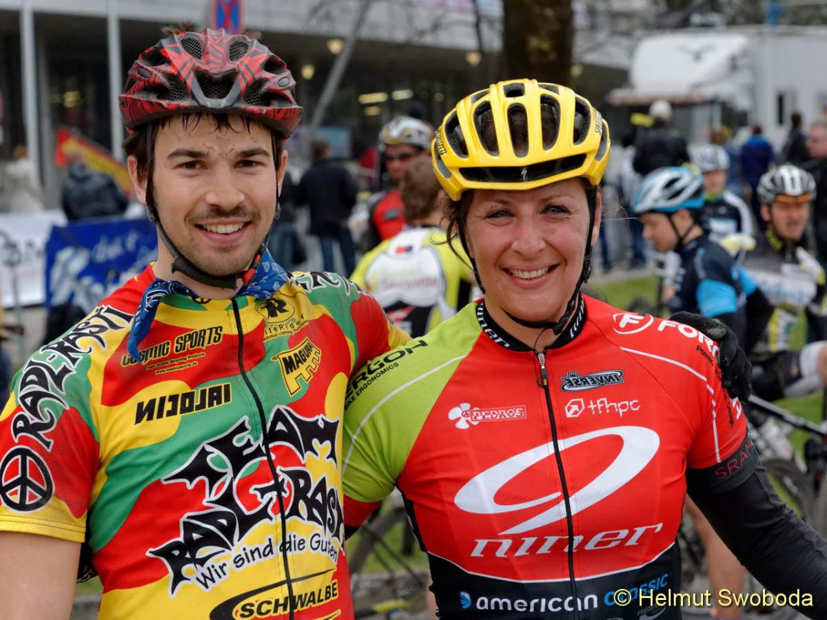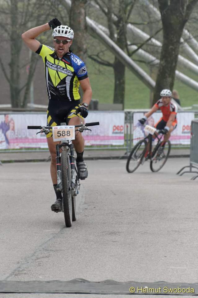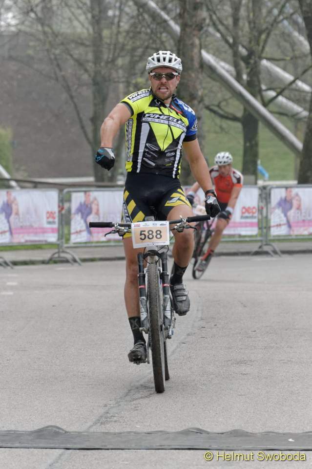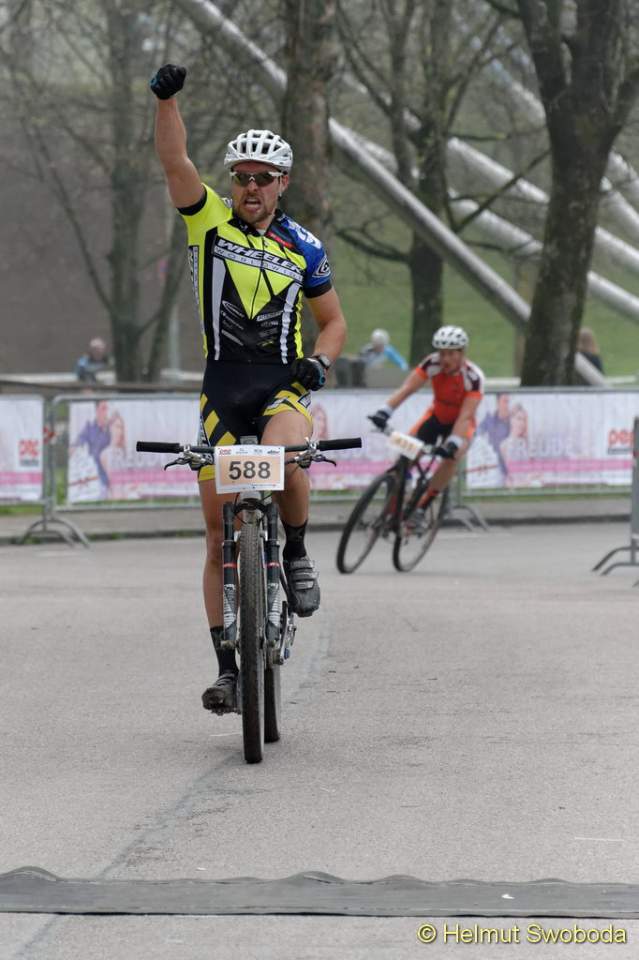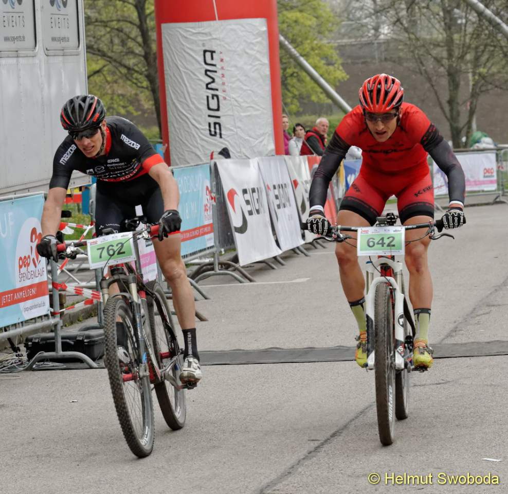 An der Spitze des Hauptrennens über die Langdistanz ging es um eine erste Standortbestimmung zu Saisonbeginn. Mit Durchschnittsgeschwindigkeiten von um die 40 km/h konnten die MTB-Profis zeigen, was sie nach einem warmen Winter bereits drauf haben. Wie in den vergangenen Jahren suchten die Favoriten eine Vorentscheidung kurz vor dem Ziel am Olympiaberg. Doch erneut gelang es keinem sich abzusetzen. Rupert Palmberger (Team Centurion Vaude), Sieger des CBM von 2012 und Zweiter im Vorjahr, führte bis zur Zielgerade neben dem Olympiastadion, wo sich sein Hauptverfolger Matthias Leising (Kreidler Werkteam) neben ihn schob und auf dem Zielstrich mit nur einer Speichenbreite Vorsprung in 2:01:20 Stunden gewann! Deutlicher dagegen der Sieg von Gabi Stanger (Team Centurion Vaude) bei den Frauen in 2:12:27 Stunden.