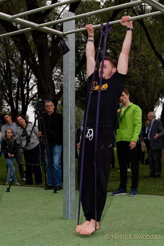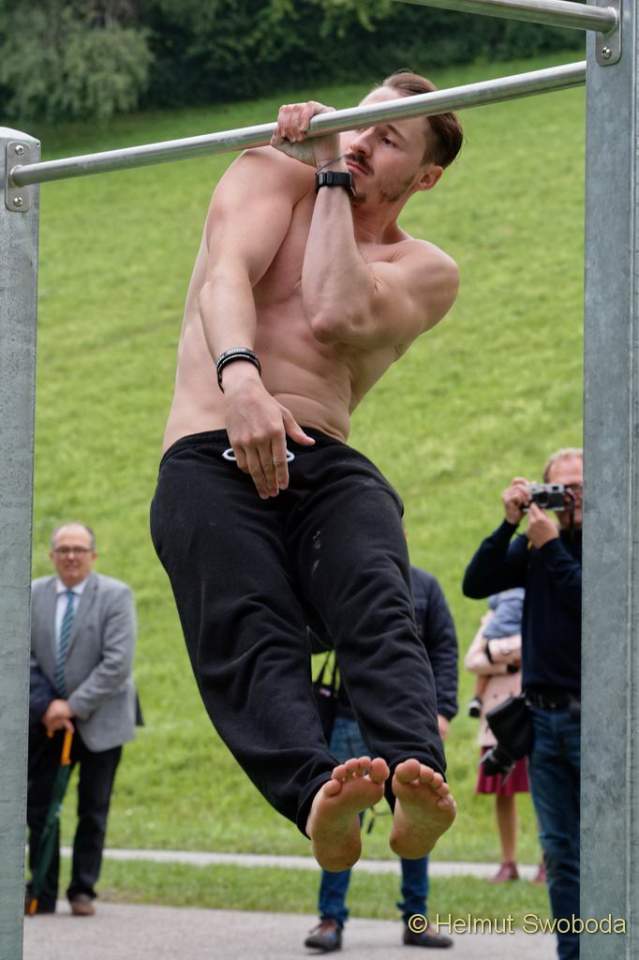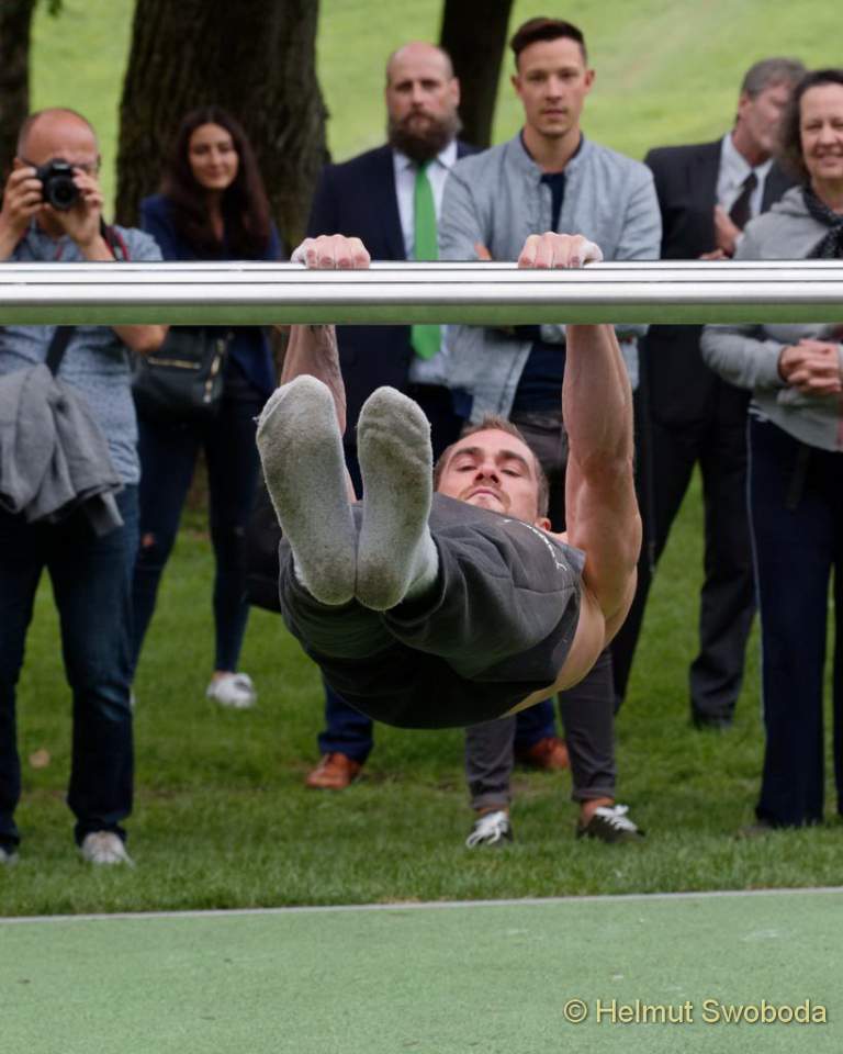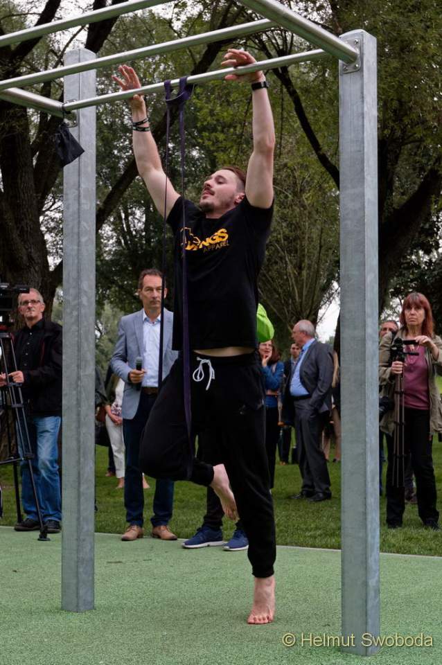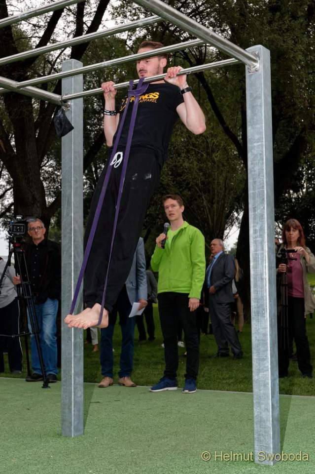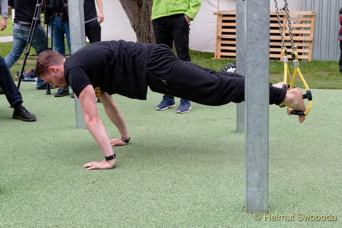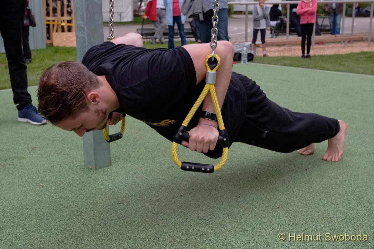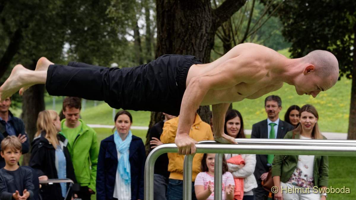 Die AOK-Bewegungsinsel umfasst insgesamt neun Fitnessgeräte auf einer 70 Quadratmeter großen Grünfläche mitten im Olympiapark. Dazu zählen beispielsweise Rückenstrecker, eine Slackline, ein Springfeld und eine Calisthenics-Station. „Die Fitnessgeräte ermöglichen ein vielseitiges Ganzkörper-Training von Ausdauer, Kraft und Koordination“, erklärt AOK-Sportexperte Maximilian Zöller. Entsprechend dem funktionellen Training stehen natürliche Bewegungsmuster im Mittelpunkt. Dabei werden statt einzelner Muskeln ganze Muskelketten trainiert. „Dies betrifft gerade auch Muskeln, die bei einem großen Teil der Gesellschaft durch den sitzenden Lebensstil abgeschwächt sind“, merkt Zöller an.