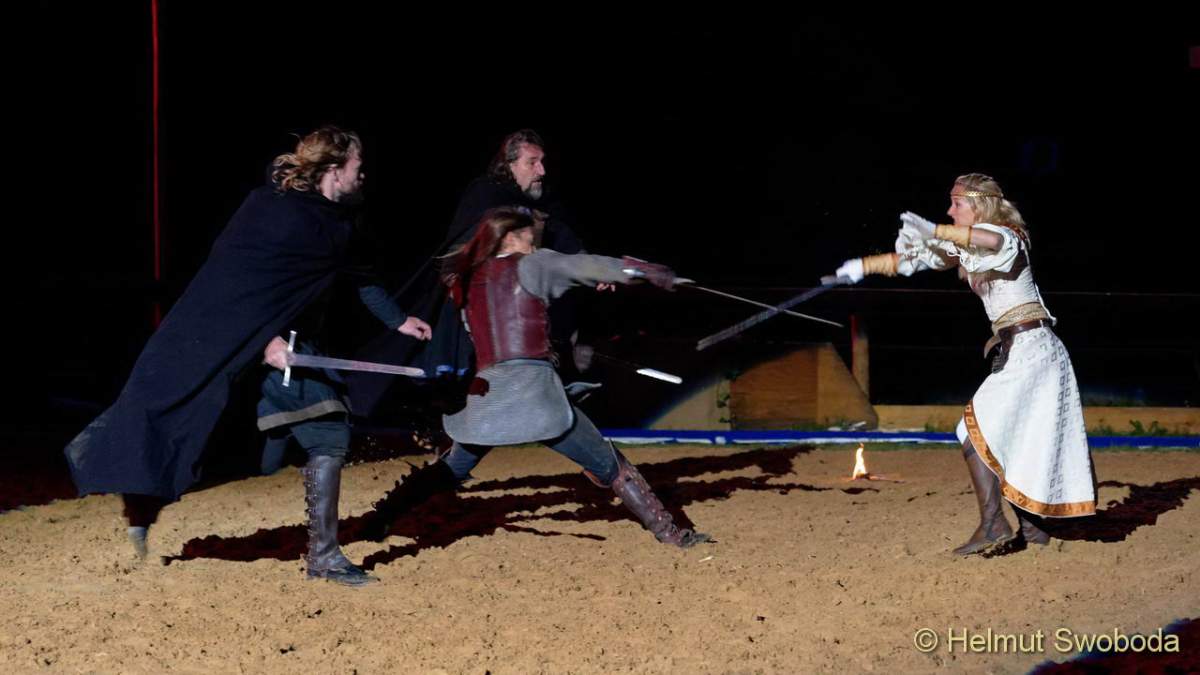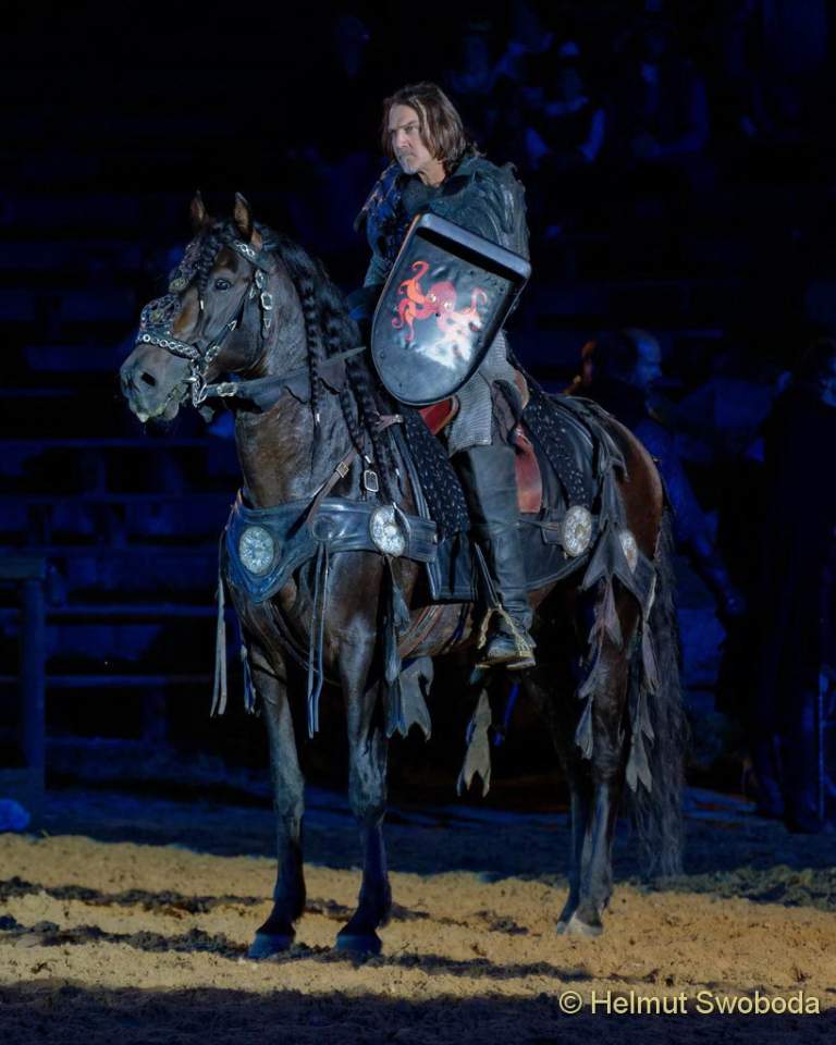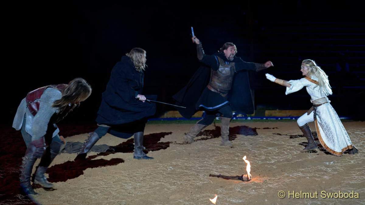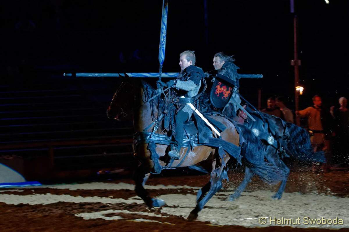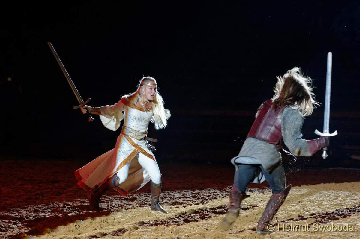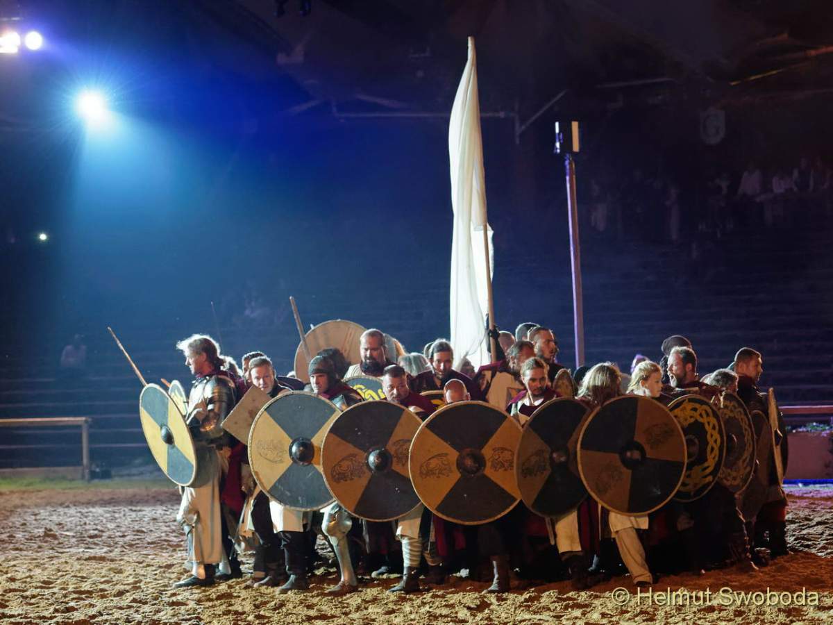 Die große Arena-Show ist der emotionale Höhepunkt eines jeden Turniertages. Tausende Zuschauer versammeln sich auf den Rängen, in den Logen oder auf den schattigen Plätzen unter dem Dach der Westtribüne, um für mehr als zwei Stunden einem Spektakel beizuwohnen, wie es das in Deutschland kein zweites Mal gibt. Mehr als 100 Darsteller sind nötig, um die Geschichte zu inszenieren, die eine emotionale Achterbahnfahrt verspricht. Mal gibt es Schockmomente, wenn mittels Pyrotechnik für überraschende Knalleffekte gesorgt wird. Mal herrscht bange Anspannung, wenn das Schlachtglück in der Arena auf der Kippe steht. Es gibt Momente der Trauer, wenn einer der Helden gefallen oder ihm ein Unglück wiederfahren ist. Und dann wieder gibt es Momente, in denen es niemanden mehr auf den Sitzen hält. Dann steht die ganze Arena, um zu sehen, was auf dem Turnierplatz vor sich geht.