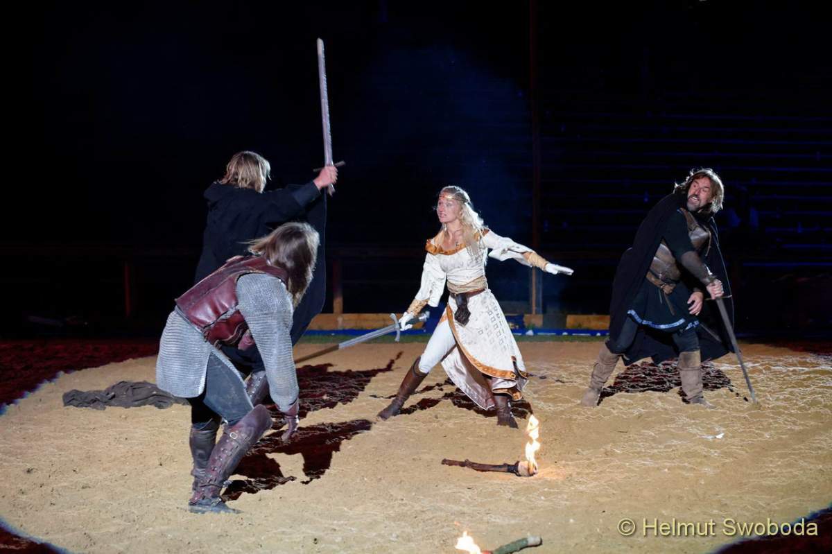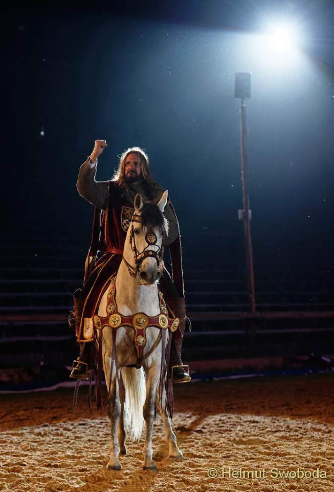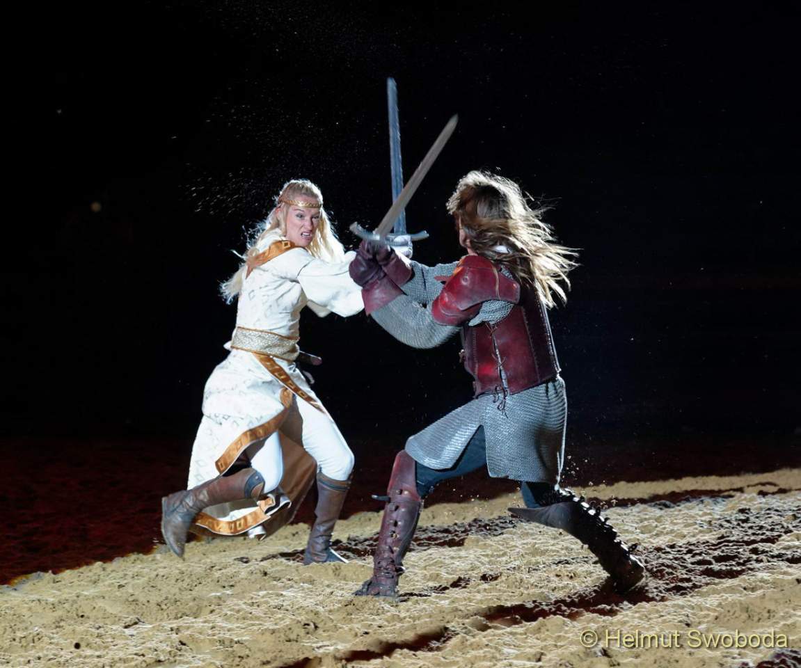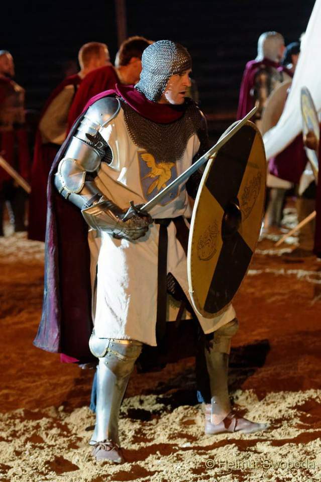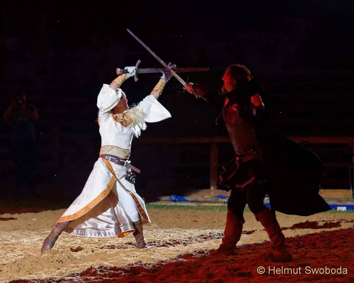 Die große Arena-Show ist der emotionale Höhepunkt eines jeden Turniertages. Tausende Zuschauer versammeln sich auf den Rängen, in den Logen oder auf den schattigen Plätzen unter dem Dach der Westtribüne, um für mehr als zwei Stunden einem Spektakel beizuwohnen, wie es das in Deutschland kein zweites Mal gibt. Mehr als 100 Darsteller sind nötig, um die Geschichte zu inszenieren, die eine emotionale Achterbahnfahrt verspricht. Mal gibt es Schockmomente, wenn mittels Pyrotechnik für überraschende Knalleffekte gesorgt wird. Mal herrscht bange Anspannung, wenn das Schlachtglück in der Arena auf der Kippe steht. Es gibt Momente der Trauer, wenn einer der Helden gefallen oder ihm ein Unglück wiederfahren ist. Und dann wieder gibt es Momente, in denen es niemanden mehr auf den Sitzen hält. Dann steht die ganze Arena, um zu sehen, was auf dem Turnierplatz vor sich geht.