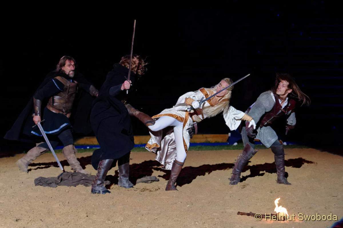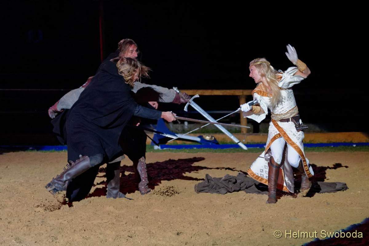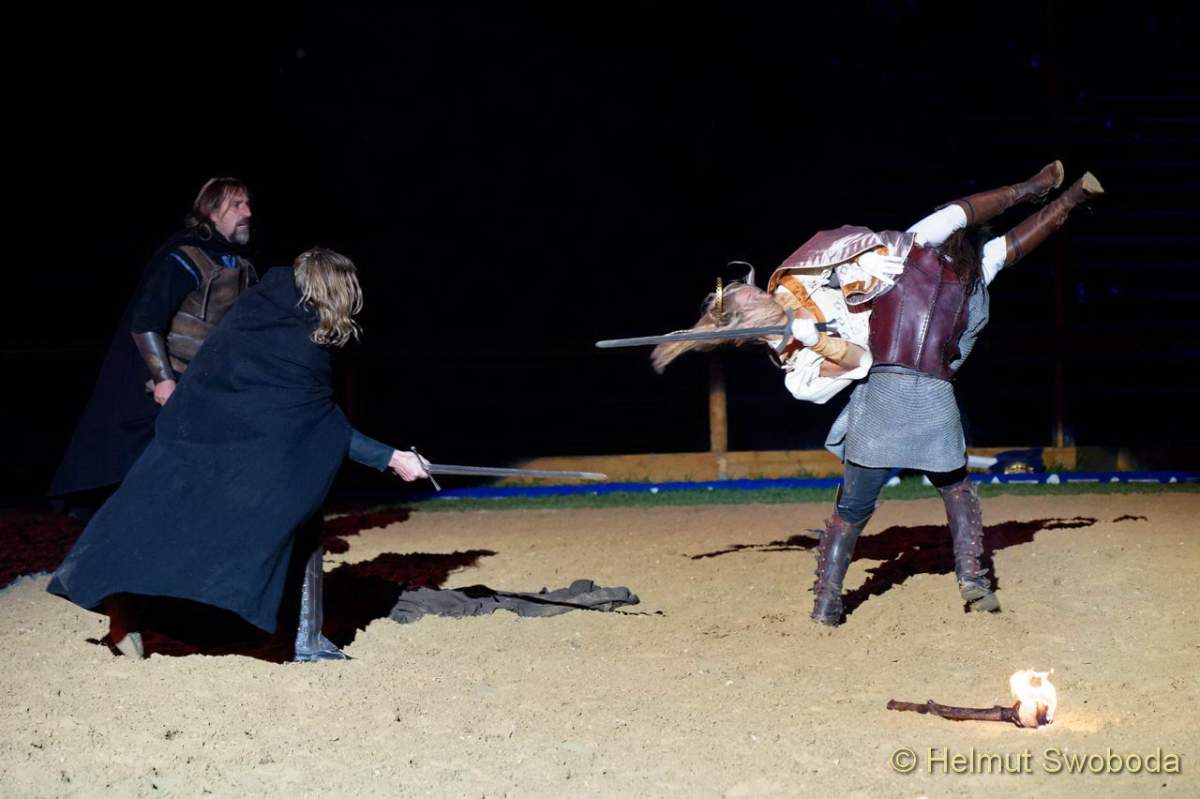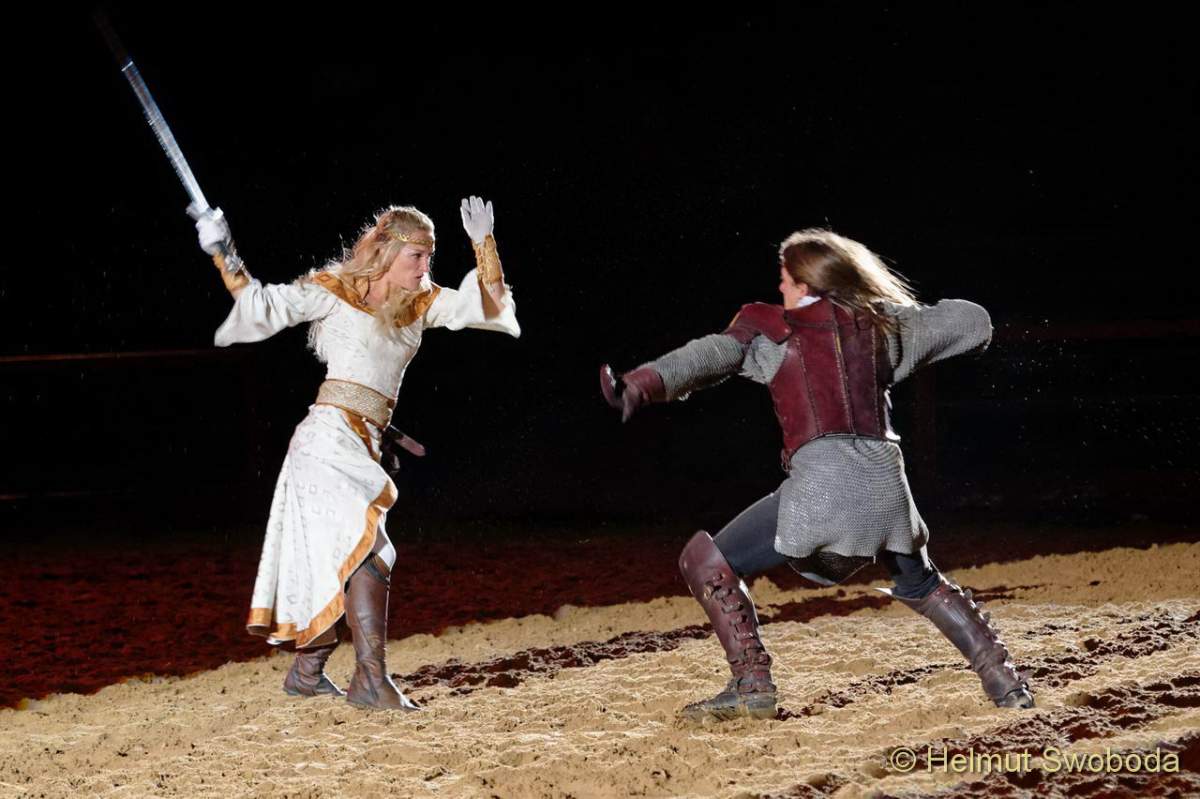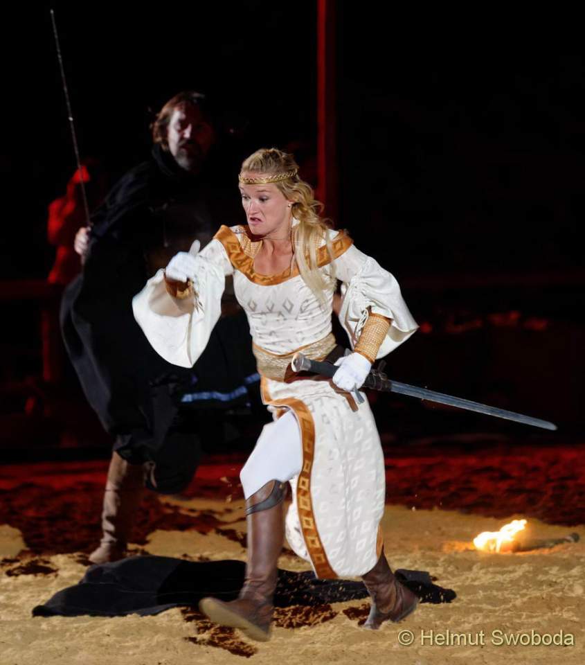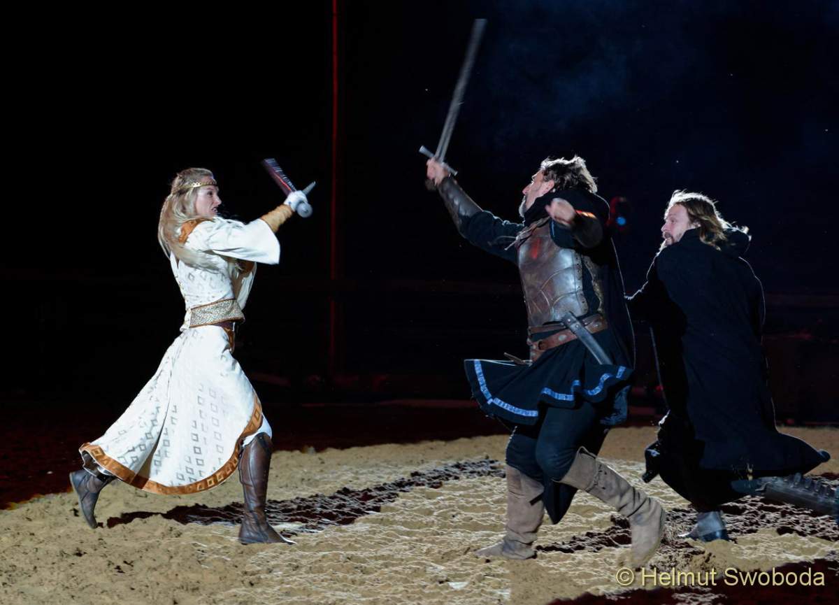 Die große Arena-Show ist der emotionale Höhepunkt eines jeden Turniertages. Tausende Zuschauer versammeln sich auf den Rängen, in den Logen oder auf den schattigen Plätzen unter dem Dach der Westtribüne, um für mehr als zwei Stunden einem Spektakel beizuwohnen, wie es das in Deutschland kein zweites Mal gibt. Mehr als 100 Darsteller sind nötig, um die Geschichte zu inszenieren, die eine emotionale Achterbahnfahrt verspricht. Mal gibt es Schockmomente, wenn mittels Pyrotechnik für überraschende Knalleffekte gesorgt wird. Mal herrscht bange Anspannung, wenn das Schlachtglück in der Arena auf der Kippe steht. Es gibt Momente der Trauer, wenn einer der Helden gefallen oder ihm ein Unglück wiederfahren ist. Und dann wieder gibt es Momente, in denen es niemanden mehr auf den Sitzen hält. Dann steht die ganze Arena, um zu sehen, was auf dem Turnierplatz vor sich geht.