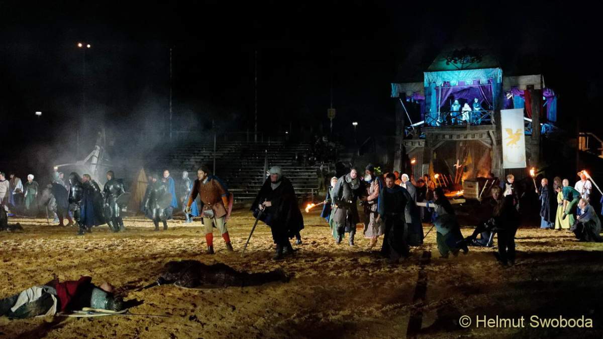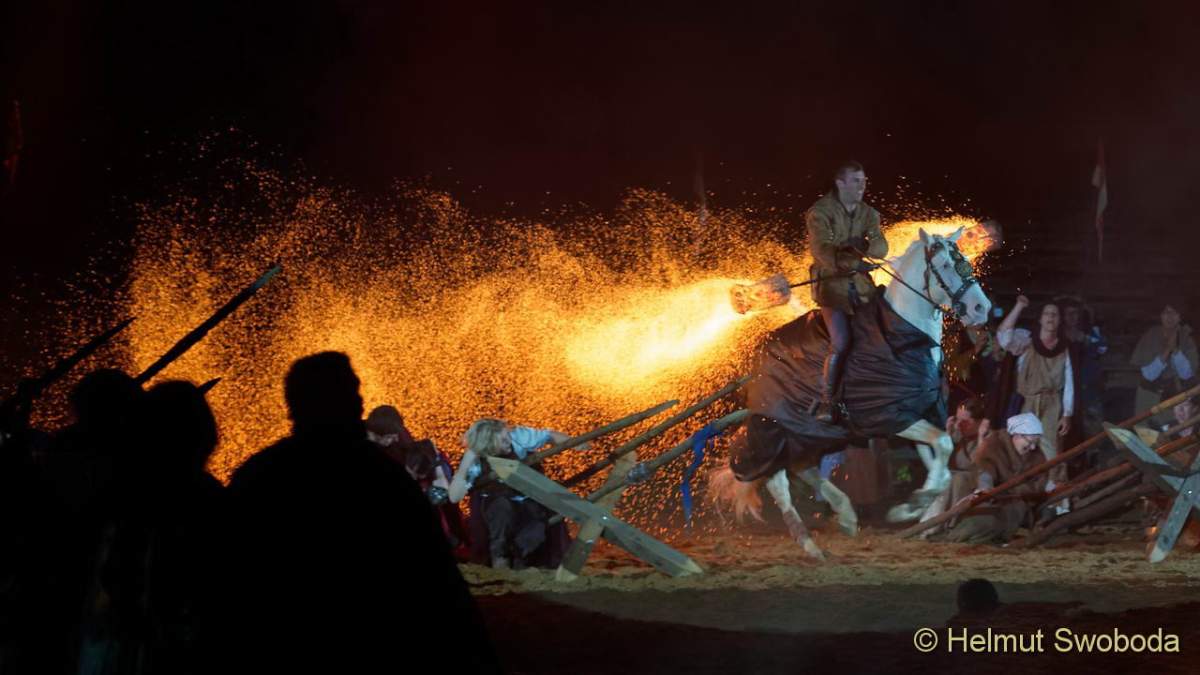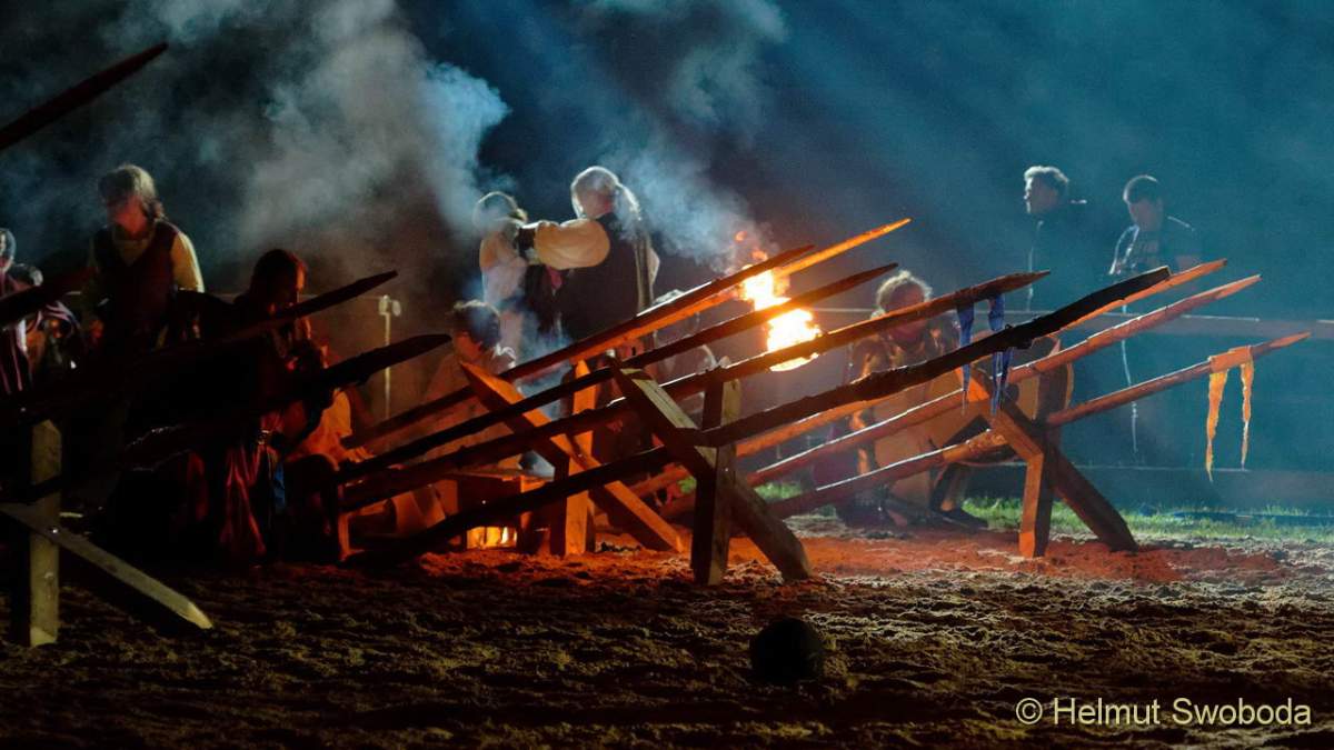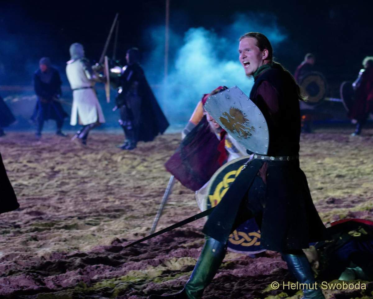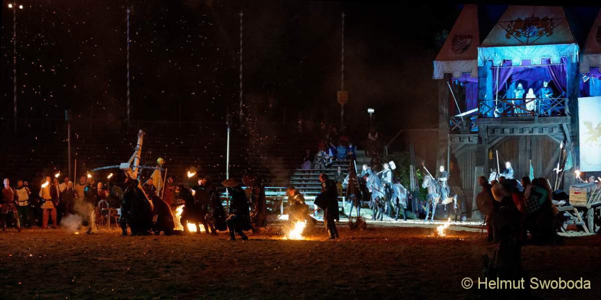 Die große Arena-Show ist der emotionale Höhepunkt eines jeden Turniertages. Tausende Zuschauer versammeln sich auf den Rängen, in den Logen oder auf den schattigen Plätzen unter dem Dach der Westtribüne, um für mehr als zwei Stunden einem Spektakel beizuwohnen, wie es das in Deutschland kein zweites Mal gibt. Mehr als 100 Darsteller sind nötig, um die Geschichte zu inszenieren, die eine emotionale Achterbahnfahrt verspricht. Mal gibt es Schockmomente, wenn mittels Pyrotechnik für überraschende Knalleffekte gesorgt wird. Mal herrscht bange Anspannung, wenn das Schlachtglück in der Arena auf der Kippe steht. Es gibt Momente der Trauer, wenn einer der Helden gefallen oder ihm ein Unglück wiederfahren ist. Und dann wieder gibt es Momente, in denen es niemanden mehr auf den Sitzen hält. Dann steht die ganze Arena, um zu sehen, was auf dem Turnierplatz vor sich geht.