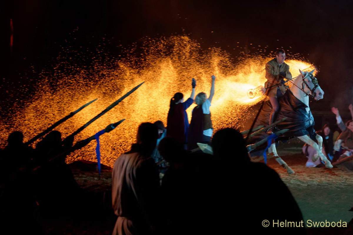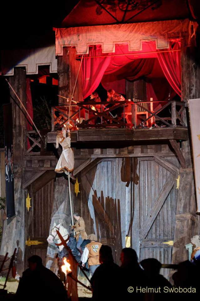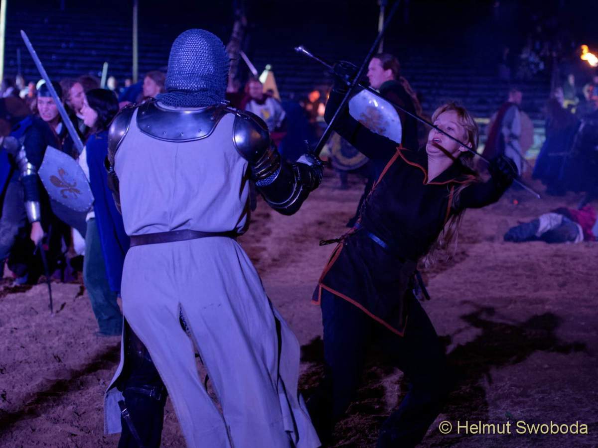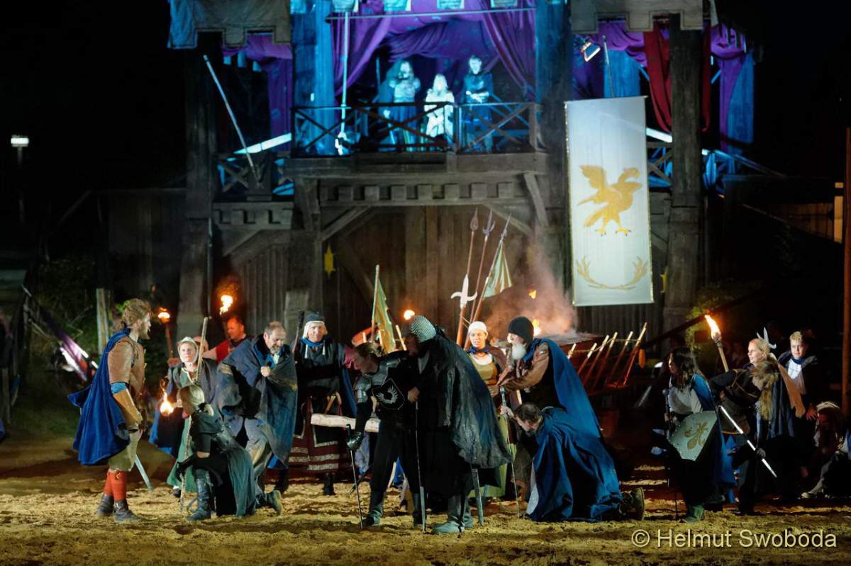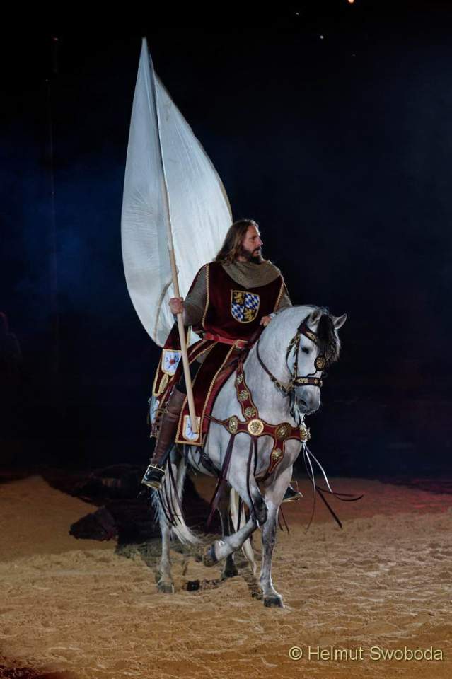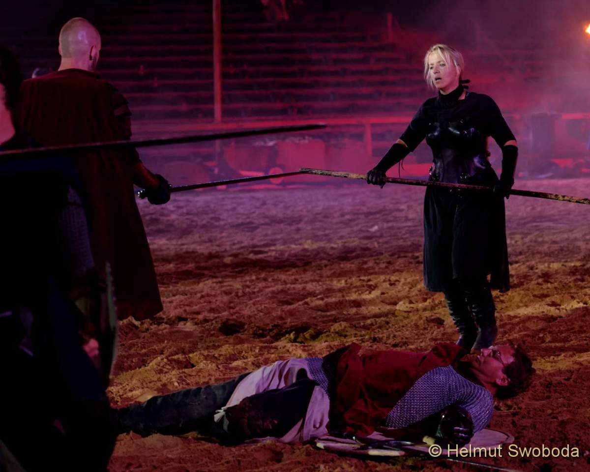 Die große Arena-Show ist der emotionale Höhepunkt eines jeden Turniertages. Tausende Zuschauer versammeln sich auf den Rängen, in den Logen oder auf den schattigen Plätzen unter dem Dach der Westtribüne, um für mehr als zwei Stunden einem Spektakel beizuwohnen, wie es das in Deutschland kein zweites Mal gibt. Mehr als 100 Darsteller sind nötig, um die Geschichte zu inszenieren, die eine emotionale Achterbahnfahrt verspricht. Mal gibt es Schockmomente, wenn mittels Pyrotechnik für überraschende Knalleffekte gesorgt wird. Mal herrscht bange Anspannung, wenn das Schlachtglück in der Arena auf der Kippe steht. Es gibt Momente der Trauer, wenn einer der Helden gefallen oder ihm ein Unglück wiederfahren ist. Und dann wieder gibt es Momente, in denen es niemanden mehr auf den Sitzen hält. Dann steht die ganze Arena, um zu sehen, was auf dem Turnierplatz vor sich geht.