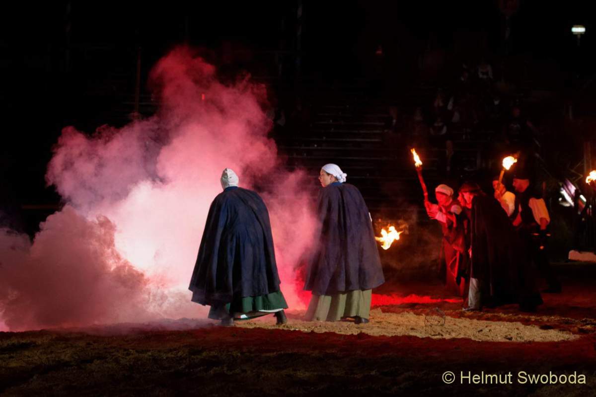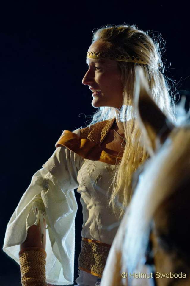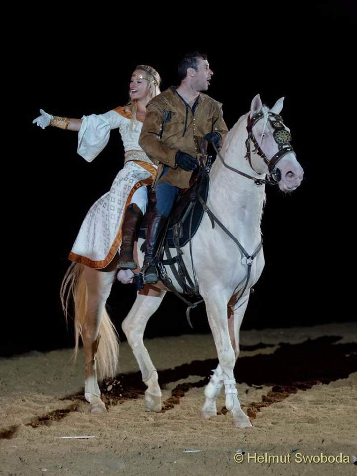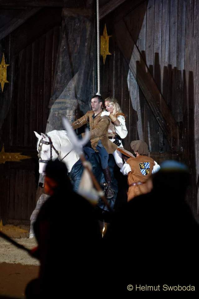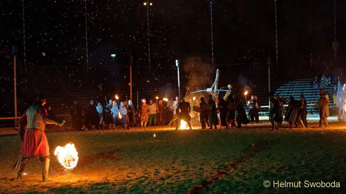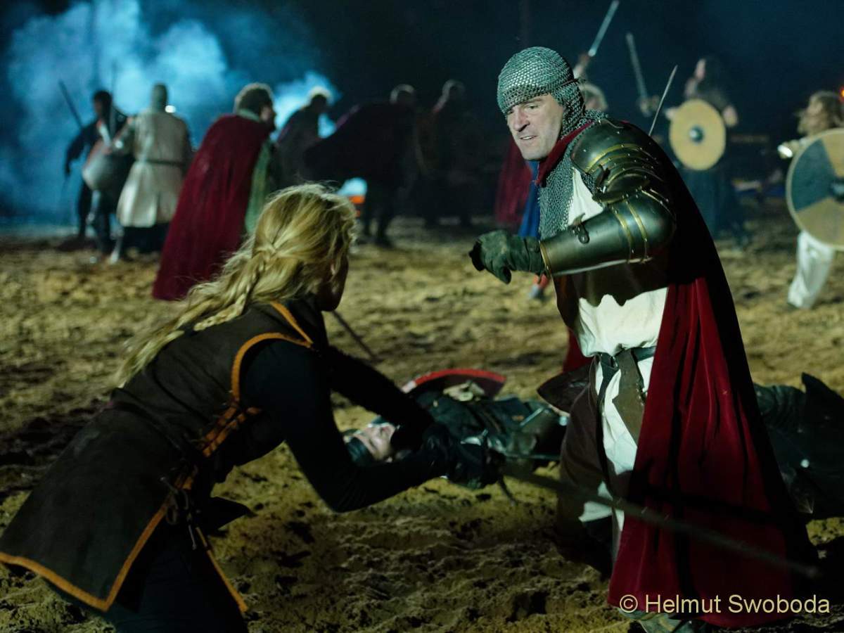 Die große Arena-Show ist der emotionale Höhepunkt eines jeden Turniertages. Tausende Zuschauer versammeln sich auf den Rängen, in den Logen oder auf den schattigen Plätzen unter dem Dach der Westtribüne, um für mehr als zwei Stunden einem Spektakel beizuwohnen, wie es das in Deutschland kein zweites Mal gibt. Mehr als 100 Darsteller sind nötig, um die Geschichte zu inszenieren, die eine emotionale Achterbahnfahrt verspricht. Mal gibt es Schockmomente, wenn mittels Pyrotechnik für überraschende Knalleffekte gesorgt wird. Mal herrscht bange Anspannung, wenn das Schlachtglück in der Arena auf der Kippe steht. Es gibt Momente der Trauer, wenn einer der Helden gefallen oder ihm ein Unglück wiederfahren ist. Und dann wieder gibt es Momente, in denen es niemanden mehr auf den Sitzen hält. Dann steht die ganze Arena, um zu sehen, was auf dem Turnierplatz vor sich geht.