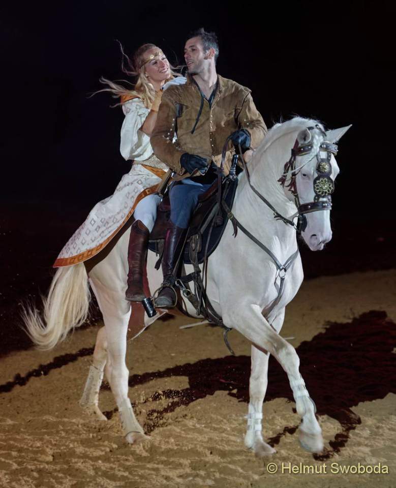 Es sind diese Arena-Atmosphäre und die Nähe zum Geschehen, die das Erlebnis des Ritterturnieres in Kaltenberg so einzigartig machen. Die Zuschauer sitzen so nah an der Action, dass sie den Schweiß auf der Stirn der Akteure sehen können. Pferde sprengen nur einen Meter entfernt vom Publikum in die Arena. Die Ausstrahlung und die Präsenz der Tiere hat etwas Magisches, dem sich niemand entziehen kann. Wie eine Urgewalt erlebt man die aufwändig inszenierten Stunts und das spektakuläre Trickriding der Stuntgruppe Cavalcade unter Führung von Mario Luraschi. Man spürt die Konzentration der Reiter, bevor sie ihre Andalusier beschleunigen und mit ihnen über den Sand fegen. Das faszinierende Trickriding wird begleitet vom Raunen, so manchem Angstschrei sowie Jubel und erlösendem Applaus, wenn Pferd und Reiter wohlbehalten ins Publikum grüßen und sich ins nächste Abenteuer stürzen. Dabei wird die waghalsige Live-Action der Cascadeure von szenisch komponierter Musik, einer prächtigen Kostümierung der Darsteller sowie aufwändigen Lichteffekten begleitet.