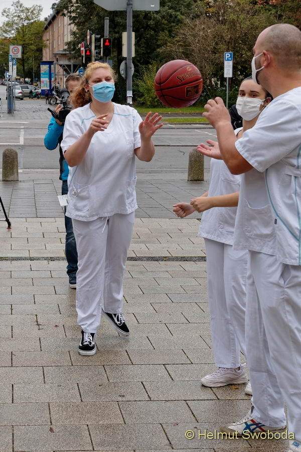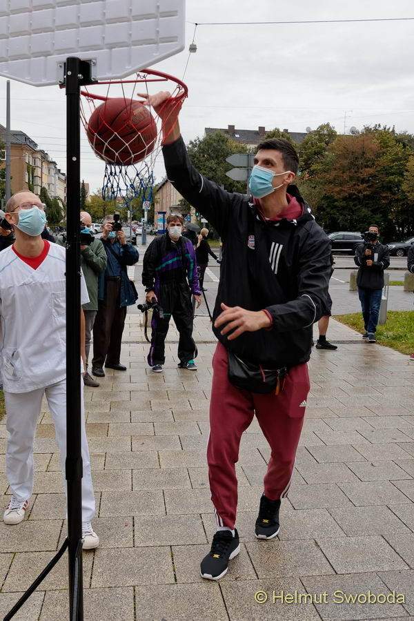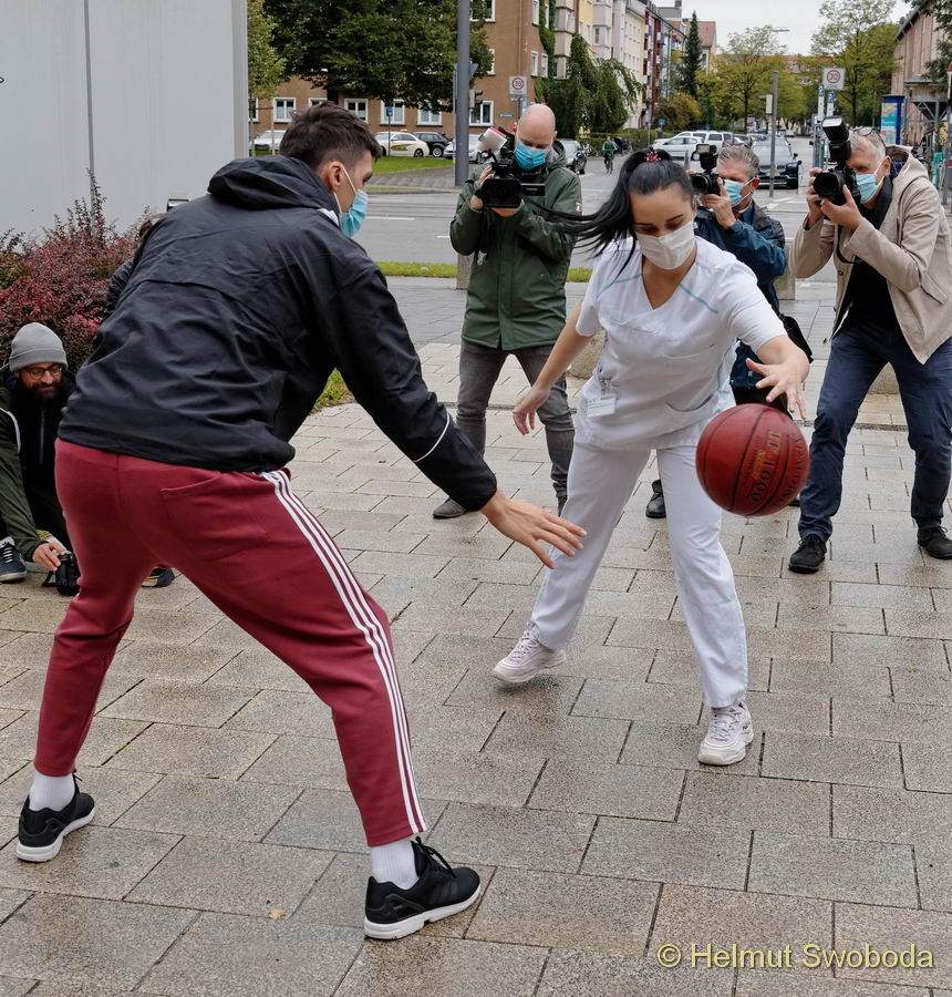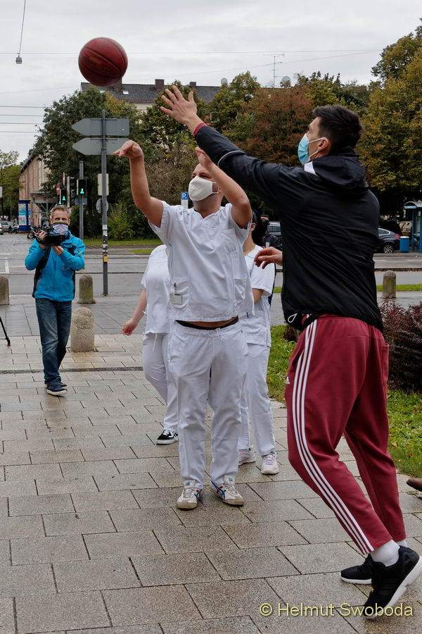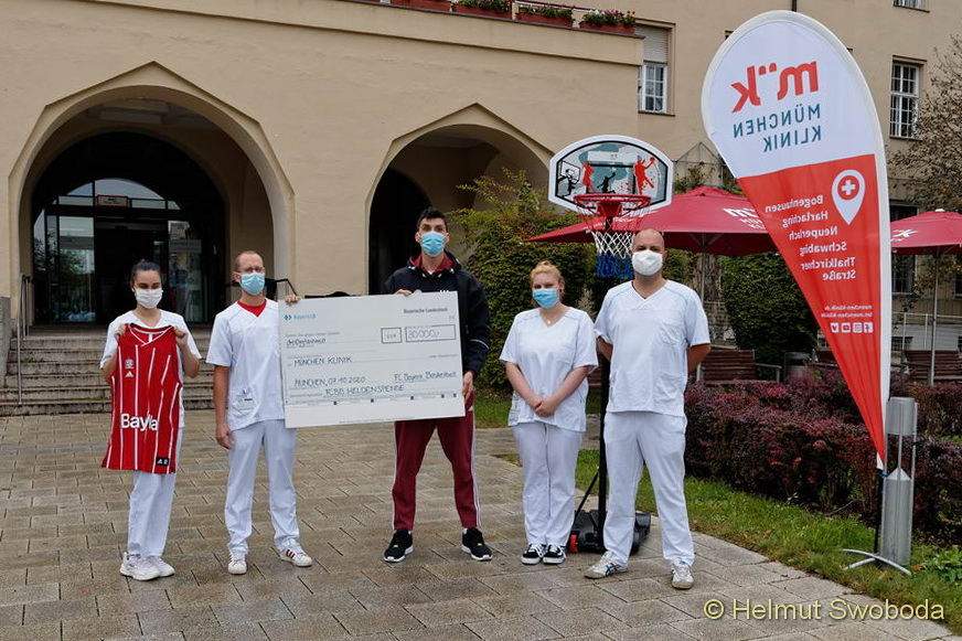 Spendenübergabe mal anders: Pflege-Azubis spielen Basketball mit den ProfisStatt eines symbolischen Spendenschecks hatte der FCBB zur Spendenübergabe am 7. Oktober ihre Profi-Basketballer mitgebracht. Am eigens vor dem Haupteingang der München Klinik Schwabing aufgestellten Basketballkorb zeigten sie ihr Können, warfen ein paar gemeinsame Körbe und ließen sich von Kapitän Nihad Djedovic erste Grundkenntnisse aus seinem Berufsfeld Basketball zeigen. Das „Crossover-Derby“ aus Pflege und Sport könnte ein Blick in die Zukunft sein, denn die München Klinik prüft aktuell den Bau eines Basketball-Courts auf dem Schwabinger Klinikgelände für die Mitarbeitenden. Solche Zusatz- und Freizeitangebote kommen den Mitarbeitern als wichtiger Ausgleich zum Schichtdienst direkt zugute und können im Gesundheitswesen nur durch Spenden finanziert werden. „Wir danken dem FCBB und insbesondere den Basketballfans sehr für die großzügige Spende – damit können wir unseren Mitarbeitenden für ihren außergewöhnlichen Einsatz in der aktuellen Situation und darüber hinaus nachhaltig etwas zurückgeben“, sagt Dr. Axel Fischer, Vorsitzender der Geschäftsführung der München Klinik. Gedacht ist die FCBB-Spende für Zusatz- und Freizeitangebote des Klinik-Personals, das können beispielsweise auch neue Kaffee-Ecken als Rückzugsorte sein sowie Förderungen des Pflegenachwuchses aus der hauseigenen Akademie.