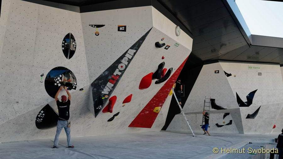 Bei allerbesten äußeren Bedingungen ging es morgens um halb zehn in Augsburg los. Die Routenbauer blieben ihrem Prinzip des Vortages treu und schraubten einen anspruchvollen ersten Boulder: Eine kleingriffige Platte war zu bezwingen, und das klare morgendliche Sonnenlicht beschien die Athletinnen bei ihren filigranen ersten Bewegungen in den langen Wettkampftag. Klettertechnische Präzision und Kreativität war denn auch in den anderen drei Bouldern gefragt. Die waren zwar durchweg überhängend, mit Kraft alleine war aber kein Blumentopf zu gewinnen.