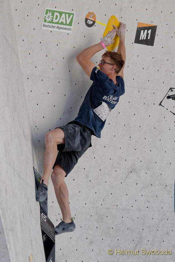 Die Bezwingung der harten Platte im ersten Boulder blieb Lasse von Freier (DAV Alpinclub Hannover) verwehrt. Auch im zweiten Boulder hatte er Probleme mit einem Fußwechsel auf einem verborgenen Tritt. Kein Wunder: Ein solcher Fußwechsel dürfte ähnlich unmöglich sein wie ein Salto vorwärts und rückwärts in einem Sprung. So ähnlich sah dann allerdings seine Einlage an Boulder drei aus: Doppeldyno mit anschließendem Weiterleiter an einen flachen, nach außen gerichteten Griff. Auf dem Weg zum Top ging es dann leider trotzdem abwärts. Am letzten Boulder kam er über den Anfangsdyno nicht hinaus.
