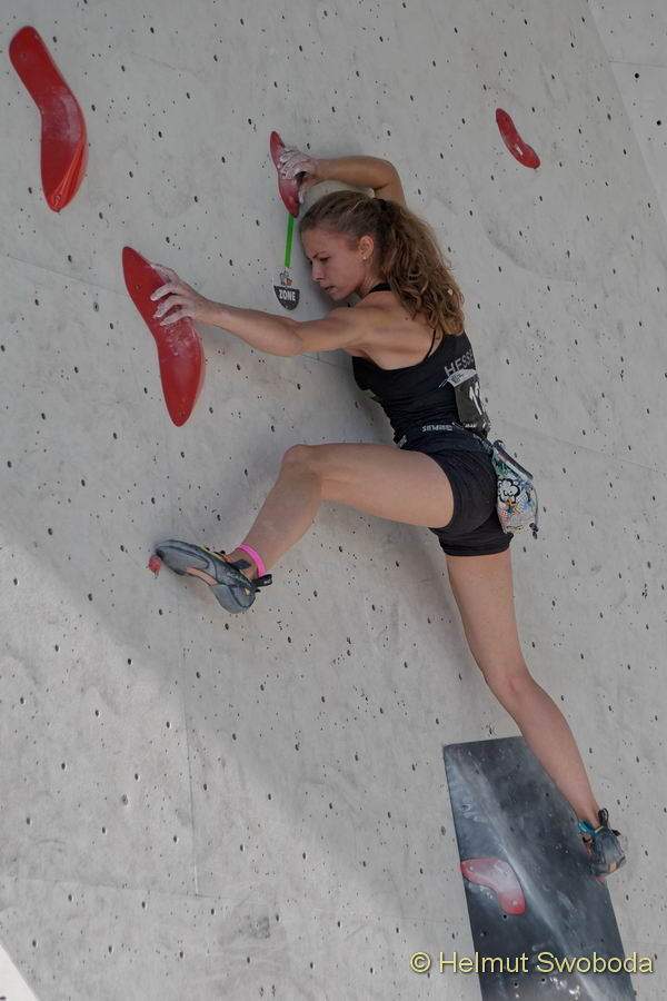 Ihre ganze Klasse zeigte Hannah Meul im zweiten Boulder und stieg bis zum Top ohne Anzeichen von Anstrengung. Im ersten Boulder musste sie zuvor einen zweiten Versuch ansetzen, der dann aber am Top landete. Ebenfalls klasse ihre Performance im dritten Boulder, den sie als insgesamt dritte Dame erfolgreich beendete. Und dann noch ihr souveräner Auftritt in Boulder vier, mit einem kleinen No-Hand-Rest, wo sonst nur Afra Hönig nach ihr einen solchen fand. Und mit einem tadellosen Flash.