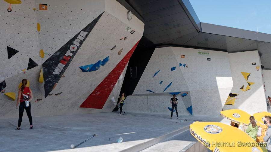Bei allerbesten äußeren Bedingungen ging es morgens um halb zehn in Augsburg los. Die Routenbauer blieben ihrem Prinzip des Vortages treu und schraubten einen anspruchvollen ersten Boulder: Eine kleingriffige Platte war zu bezwingen, und das klare morgendliche Sonnenlicht beschien die Athletinnen bei ihren filigranen ersten Bewegungen in den langen Wettkampftag. Klettertechnische Präzision und Kreativität war denn auch in den anderen drei Bouldern gefragt. Die waren zwar durchweg überhängend, mit Kraft alleine war aber kein Blumentopf zu gewinnen.