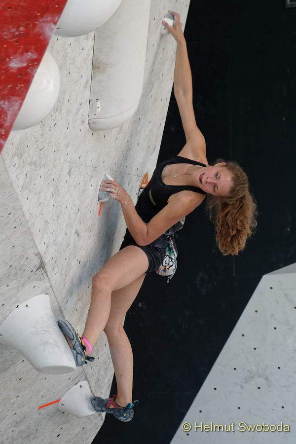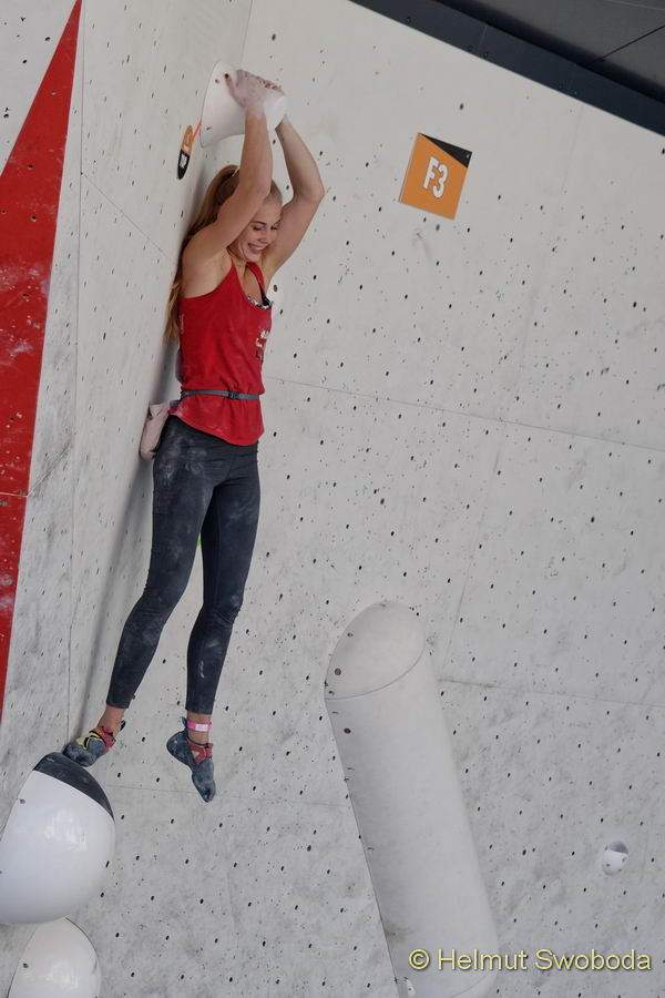 Einen richtig guten Start legte Alma Bestvater hin, sie kletterte im Flash über die heikle Platte. Auch der zweite Boulder gelang ihr in diesem Stil. Am dritten Problem hatte sie Probleme – so wie alle Konkurrentinnen zuvor. Leider wollte ihr nicht einmal die Zone gelingen. Dass sie auch am letzten Boulder den Topgriff nicht erreicht war am Ende nicht schlimm: Weil das Halbfinale insgesamt sehr hart geschraubt war, reichten zwei Tops für den Einzug ins Finale der besten Sechs.