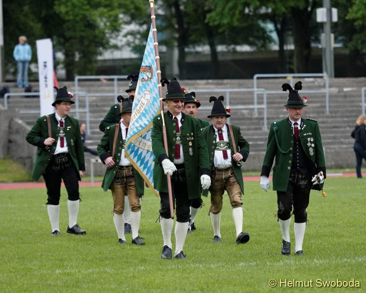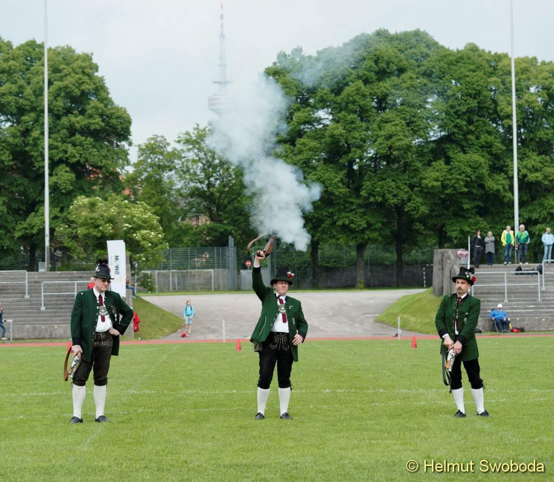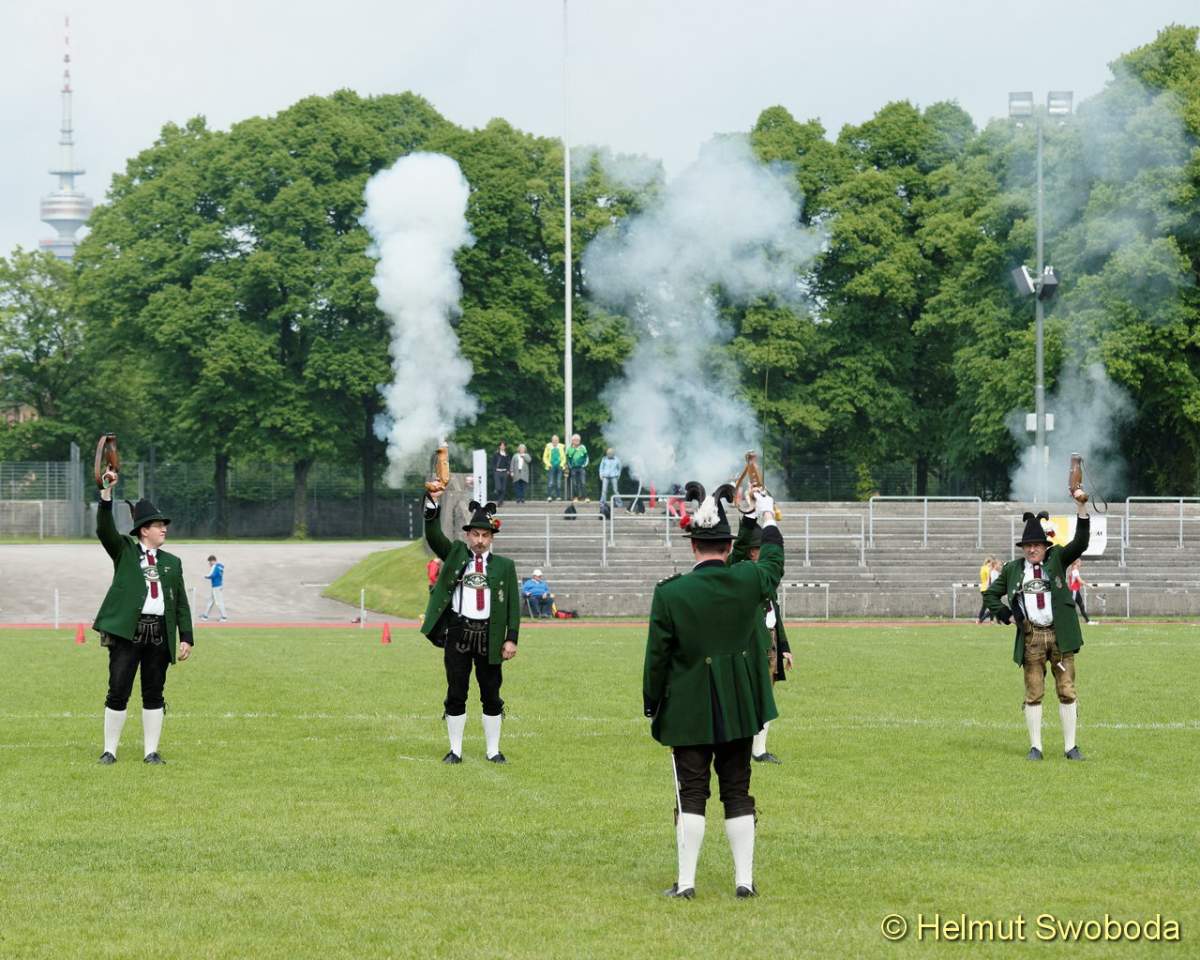 Ab 16 Uhr leitete die Böllerschützenkompanie Feldmoching imposant und lautstark zum internationalen Teil des Pfingstmeetings über.